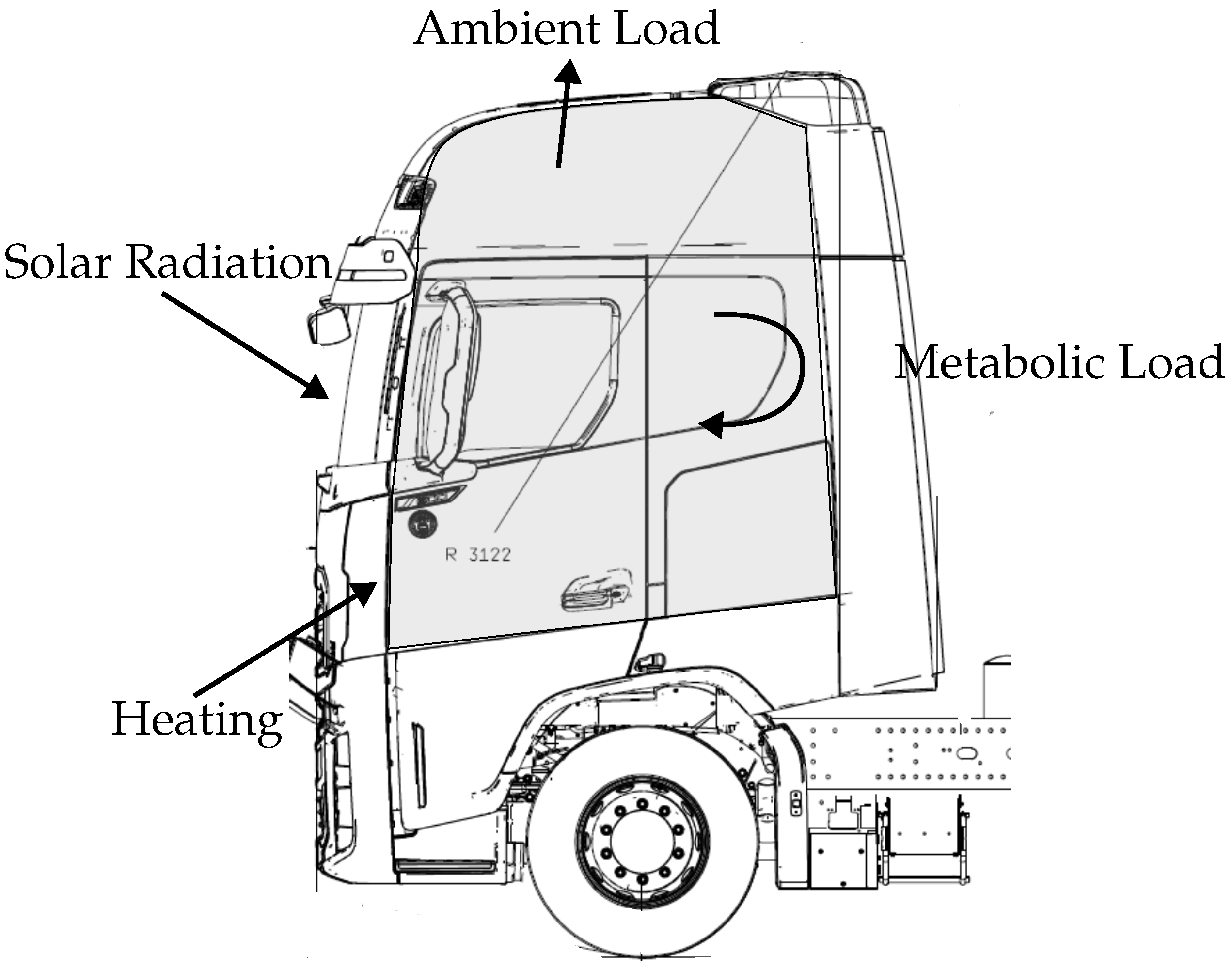 Figure 5 represents the thermal loads affecting the thermal balance of a vehicle cabin.