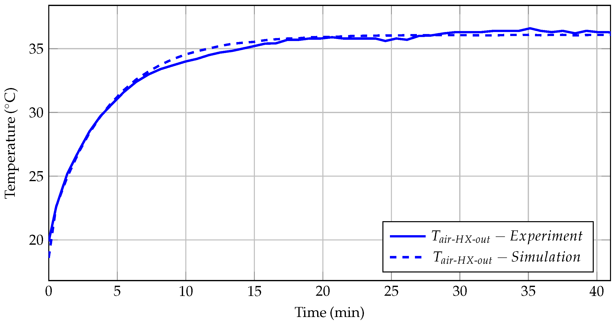 Figure 12 compares the air temperature at the outlet of the heat exchanger in the measurements and in the simulation. Since the sensors used here are more accurate, the model predictions are even closer to reality. The slightly higher temperatures observed in the experimental data may be due to the warming effect of nearby components such as hoses and expansion tanks located near the air intake point.