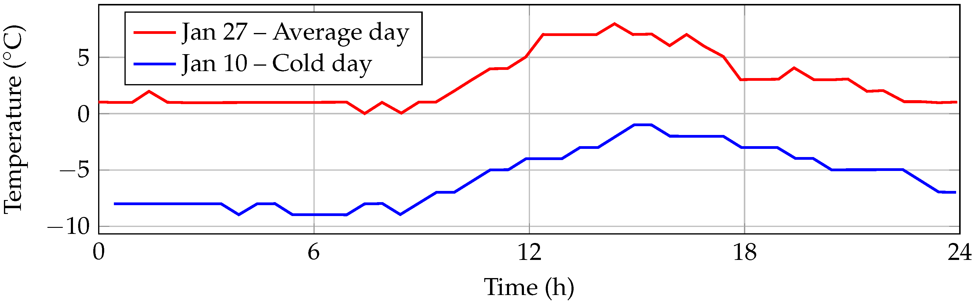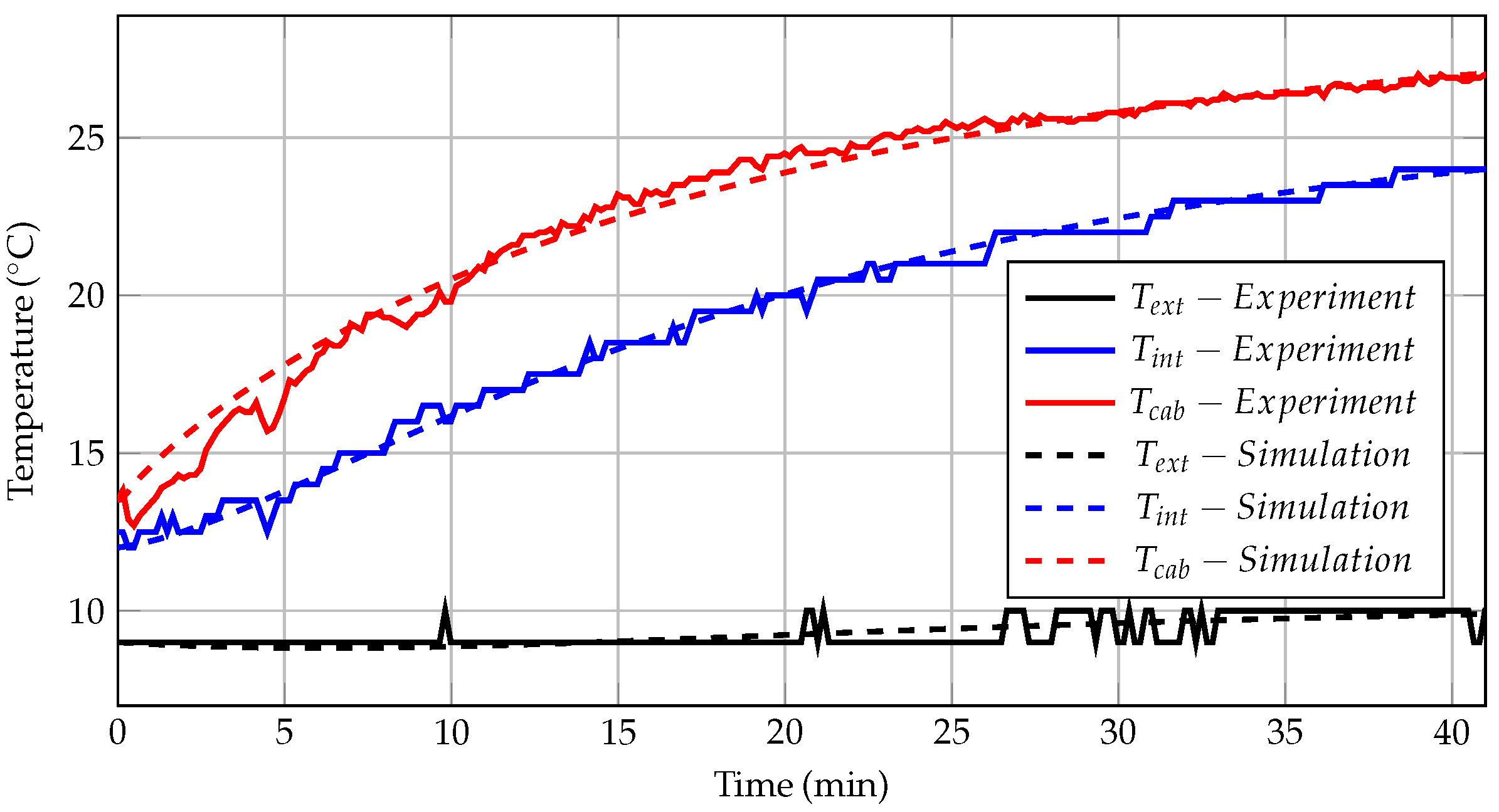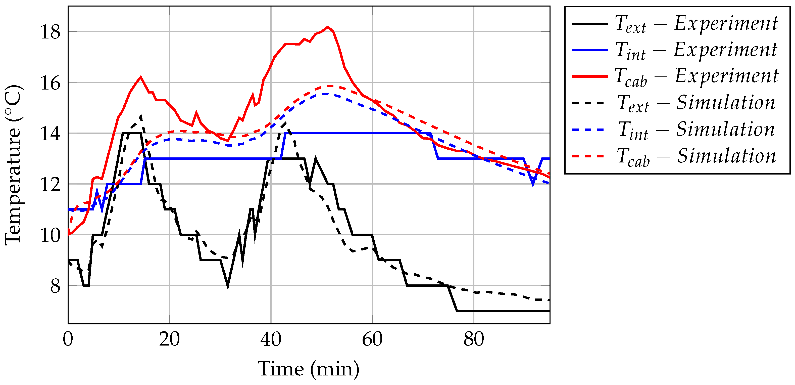 The first test was carried out after sunset to exclude the influence of solar radiation. The two remaining loads acting on the cabin are the heat input from the high-voltage heating system, kept constant at , and the heat loss to the environment. The heat loss consists of three components: , determined by the internal convection coefficient ; , determined by the ratio of thermal conductivity to wall thickness, ; and , determined by the external convection coefficient . The following temperatures were recorded for validation: ambient air temperature, exterior and interior surface temperatures of the cabin, and cabin air temperature. The aim was to estimate the heat transfer coefficients for internal and external convection, the thermal resistance of the cabin walls, and the thermal masses of various components in order to match the simulated temperature profiles with the experimental data.