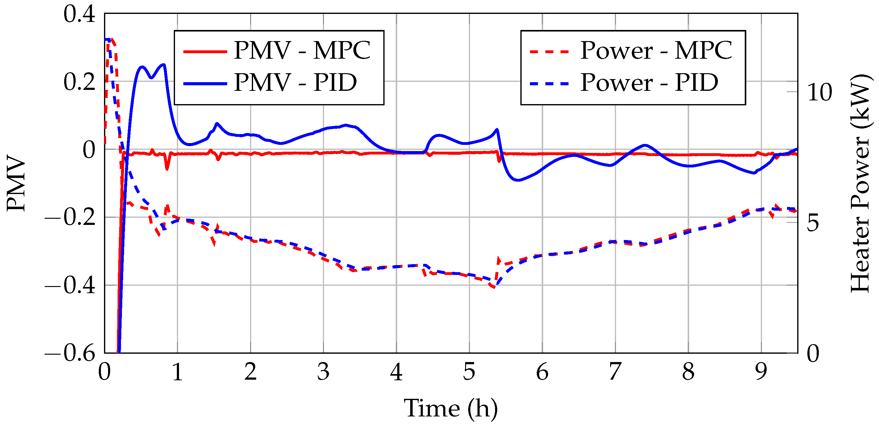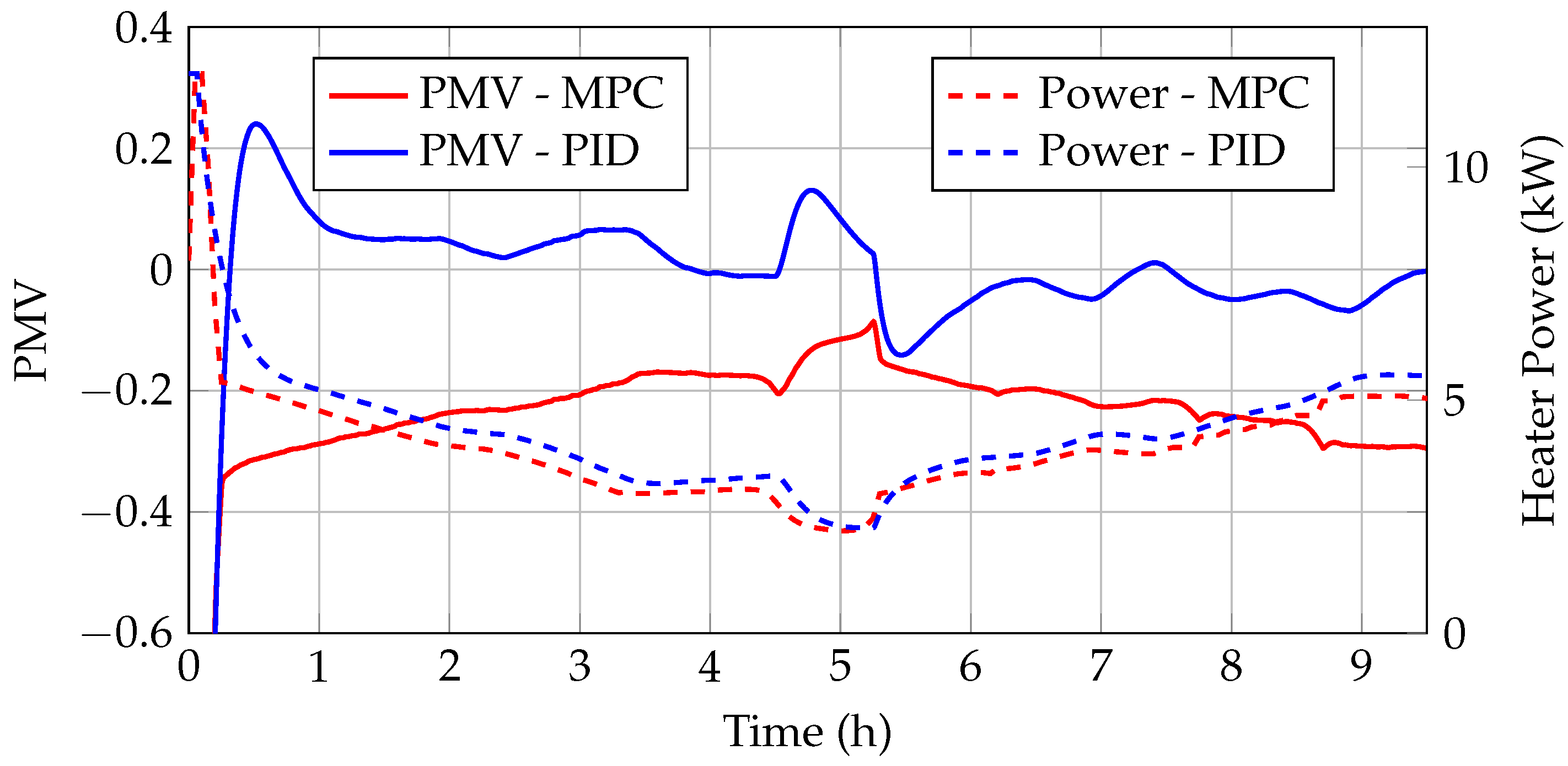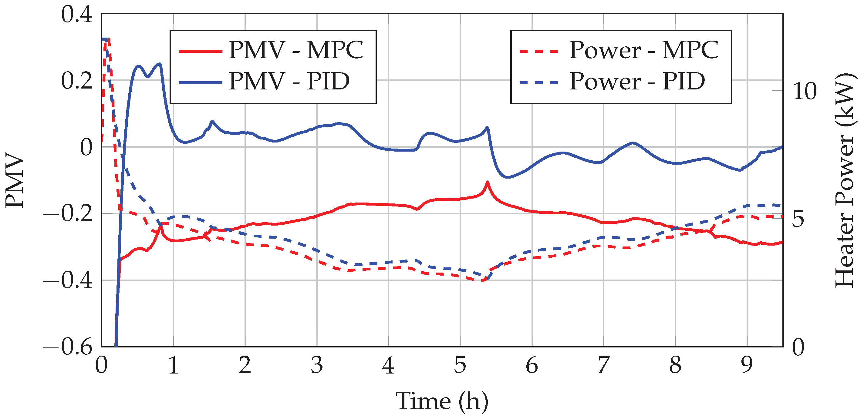 The primary objective of the MPC is to optimize energy consumption while maintaining thermal comfort in the cabin. Energy consumption is quantified by the electrical heater power, whereas thermal comfort is assessed using the PMV index. The MPC is designed to unify and balance these two potentially conflicting goals: maintaining thermal comfort while minimizing energy consumption.
