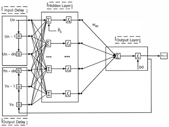 NARX stands for Nonlinear Autoregressive Exogenous model, and is illustrated in Figure 1, which shows its mathematical structure. The model consists of three layers: an input layer, a hidden layer, and an output layer, along with a feedback connection from the output layer back to the input layer. The input layer includes an input block for storing the input time series and an output block for storing the output time series.