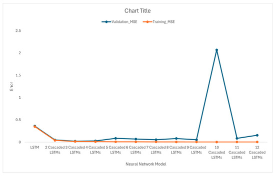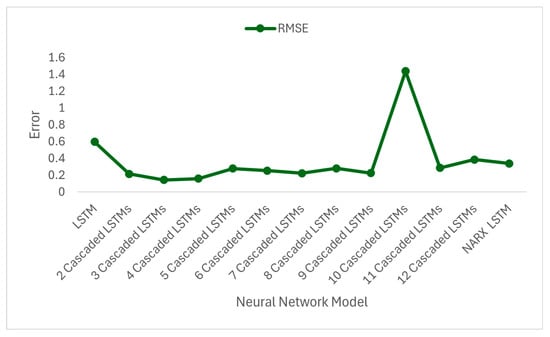 After calculating the error, it was found that the least error occurred when three cascaded LSTM networks were used, as shown in Figure 3. The addition of more networks beyond this point did not significantly improve the model’s accuracy and, in some cases, led to an increase in error due to overfitting and error propagation. This indicates that the optimal number of cascaded LSTMs is highly dependent on the dataset’s complexity. The best number was determined by finding the minimum values for MAE, MSE, and RMSE across different configurations, with three layers consistently providing the lowest error.
