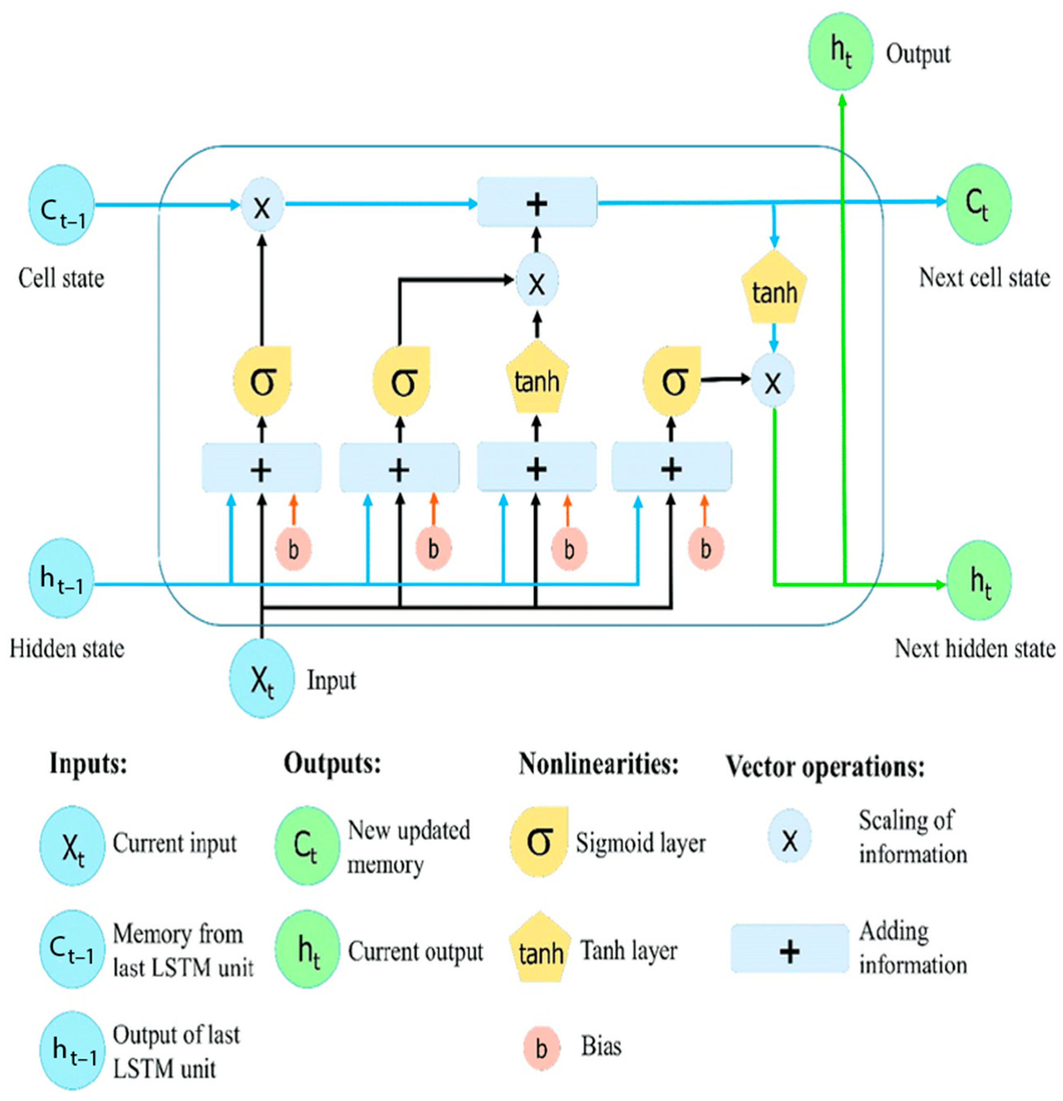 The model of LSTM has three inputs Ct − 1, ht − 1, and Xt. where Ct − 1, ht − 1 are the output of the previous cell in case there is a previous cell, and Xt is the input for the cell from the data that should be processed. The processing in the cell is a combination of sigmoid, tanh, additions, and multiplications. The output of the cell is Ct, and ht. where Ct is the information that is used as a memory to the next cell if there is a next cell, and ht is the output of the processed data.