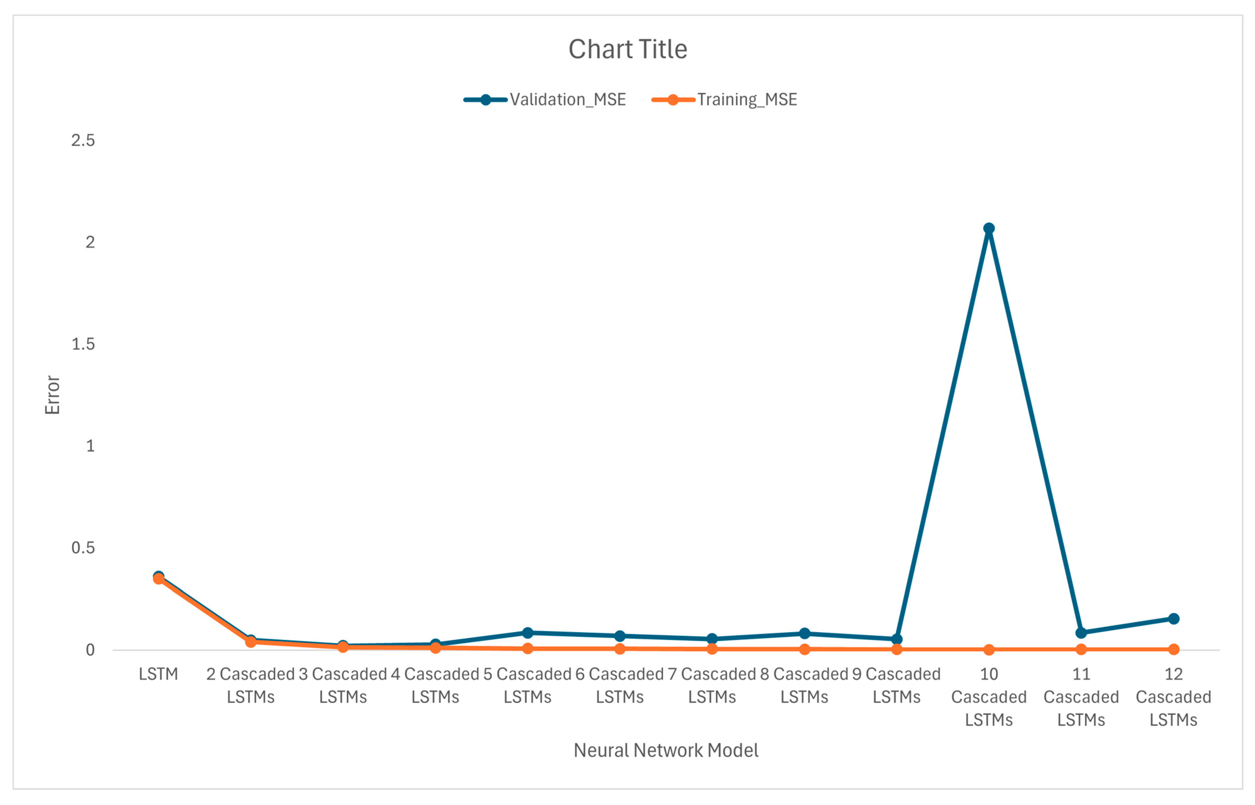 Figure 3. The addition of more networks beyond this point did not significantly improve the model’s accuracy and, in some cases, led to an increase in error due to overfitting and error propagation. This indicates that the optimal number of cascaded LSTMs is highly dependent on the dataset’s complexity. The best number was determined by finding the minimum values for MAE, MSE, and RMSE across different configurations, with three layers consistently providing the lowest error.
