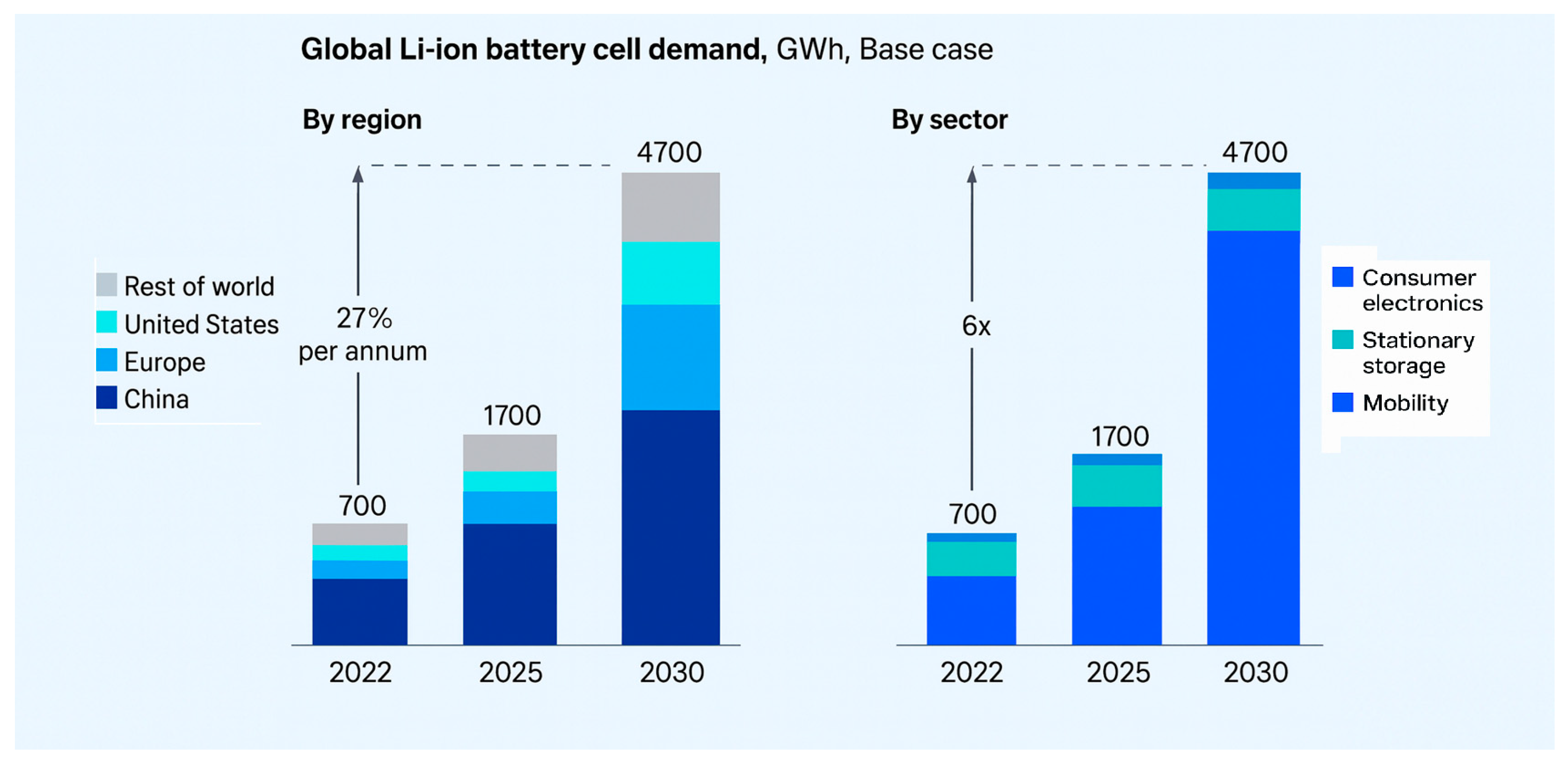 - When the battery is connected to a charger, an external electric field forces lithium ions (Li+) to move from the cathode, see Equation (1). through the electrolyte and separator toward the anode (graphite). At the same time, electrons flow through the external circuit to the anode, balancing the charge. Lithium ions intercalate (embed) into the graphite layers of the anode, see Equation (2). Energy is stored in the battery in this process.