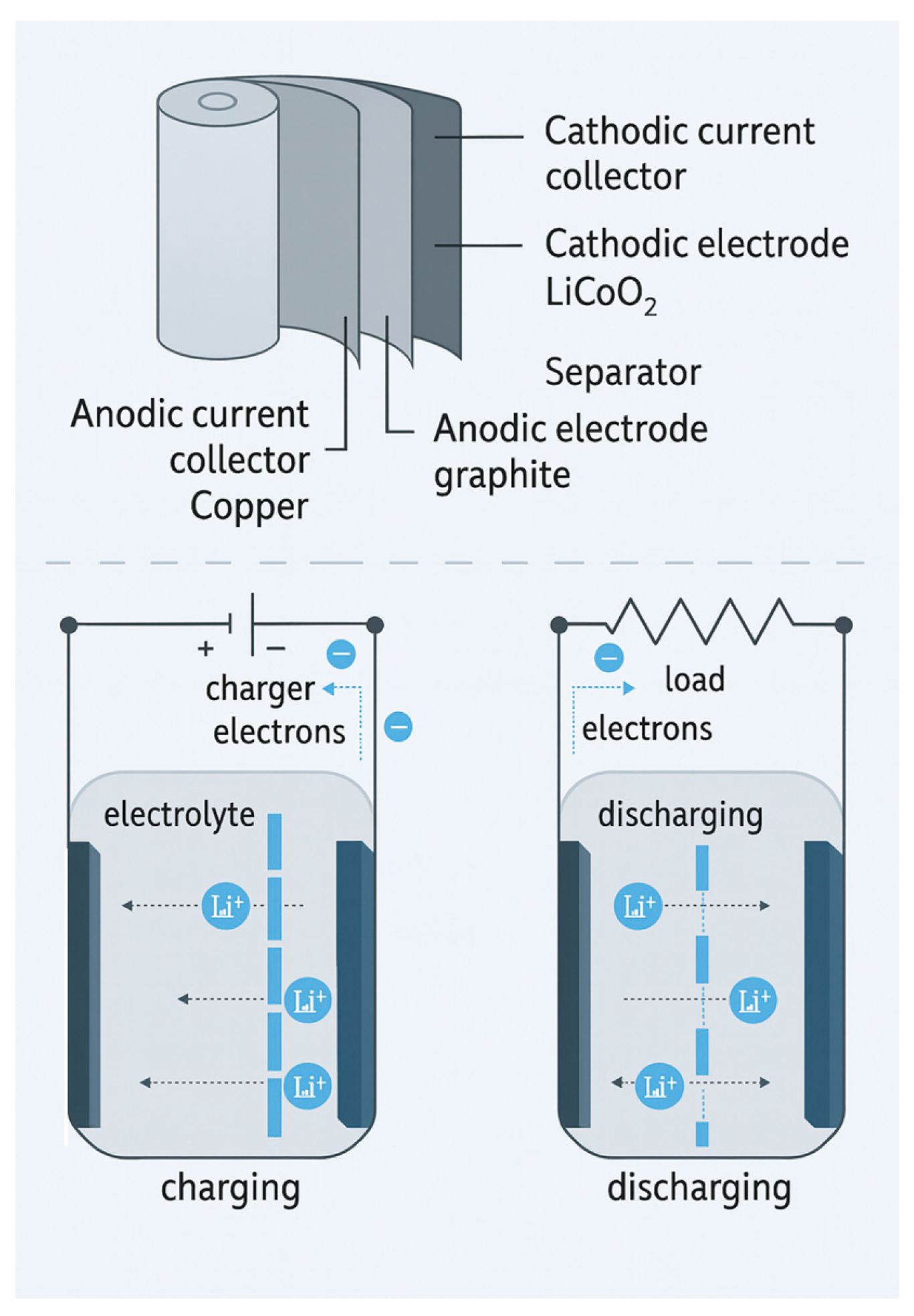 - When the battery powers a load, the lithium ions move from the anode back to the cathode via the electrolyte. Simultaneously, electrons flow through the external circuit, supplying power to the connected device. Lithium ions are deintercalated from graphite and return to the LiCoO2 structure, see Equation (1). This process releases the stored energy.