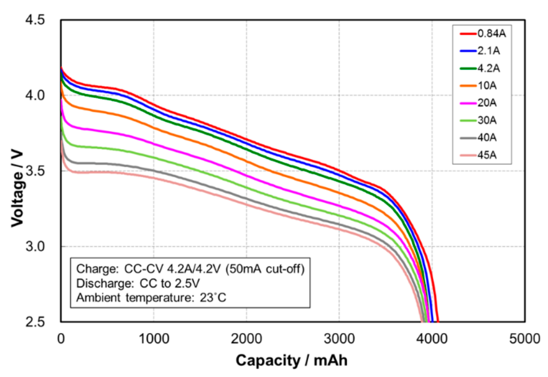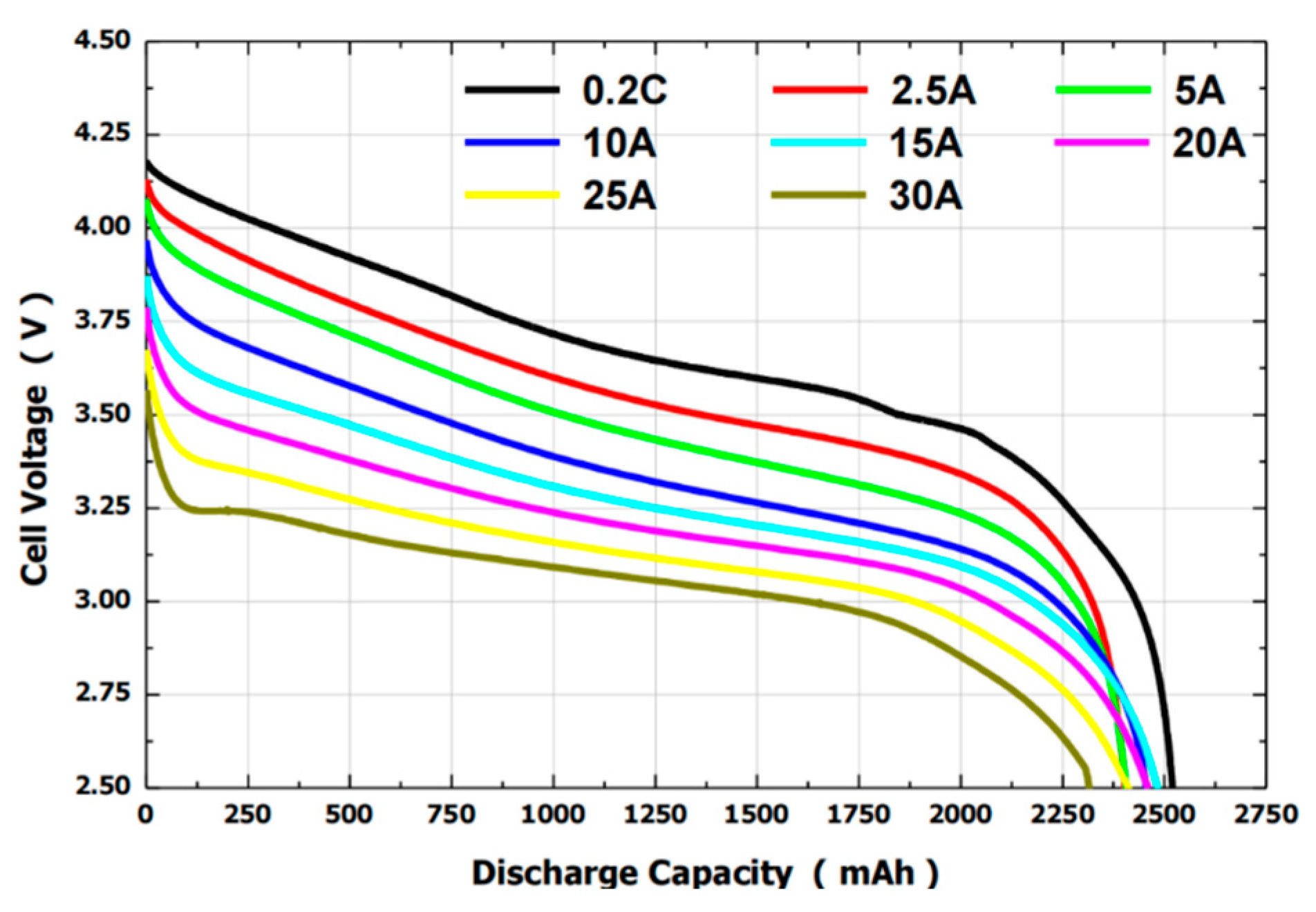 - The 2170 (21700) Cell has dimensions of 21 mm in diameter and 70 mm in length. Typical EV 2170 cell is around 4.5–5.0 Ah each, which is about (4800–5000 mAh) [49,52], with energy density of 260–300 Wh/kg [53]. Figure 9 is the discharge characteristic plot for 2170 lithium-ion cells for voltage versus capacity at different constant current rates (0.84 A to 45 A). Higher discharge rates lead to lower operating voltages and reduced usable capacity [52]. Each 2170 cell holds more energy than a 18650, so an EV pack can use fewer cells to achieve the same capacity.Figure 9. Discharge Characteristics of 2170 Cylindrical Lithium-Ion Cells, Lithium-Ion Cells, Reprinted with permission from [52].Figure 9. Discharge Characteristics of 2170 Cylindrical Lithium-Ion Cells, Lithium-Ion Cells, Reprinted with permission from [52].