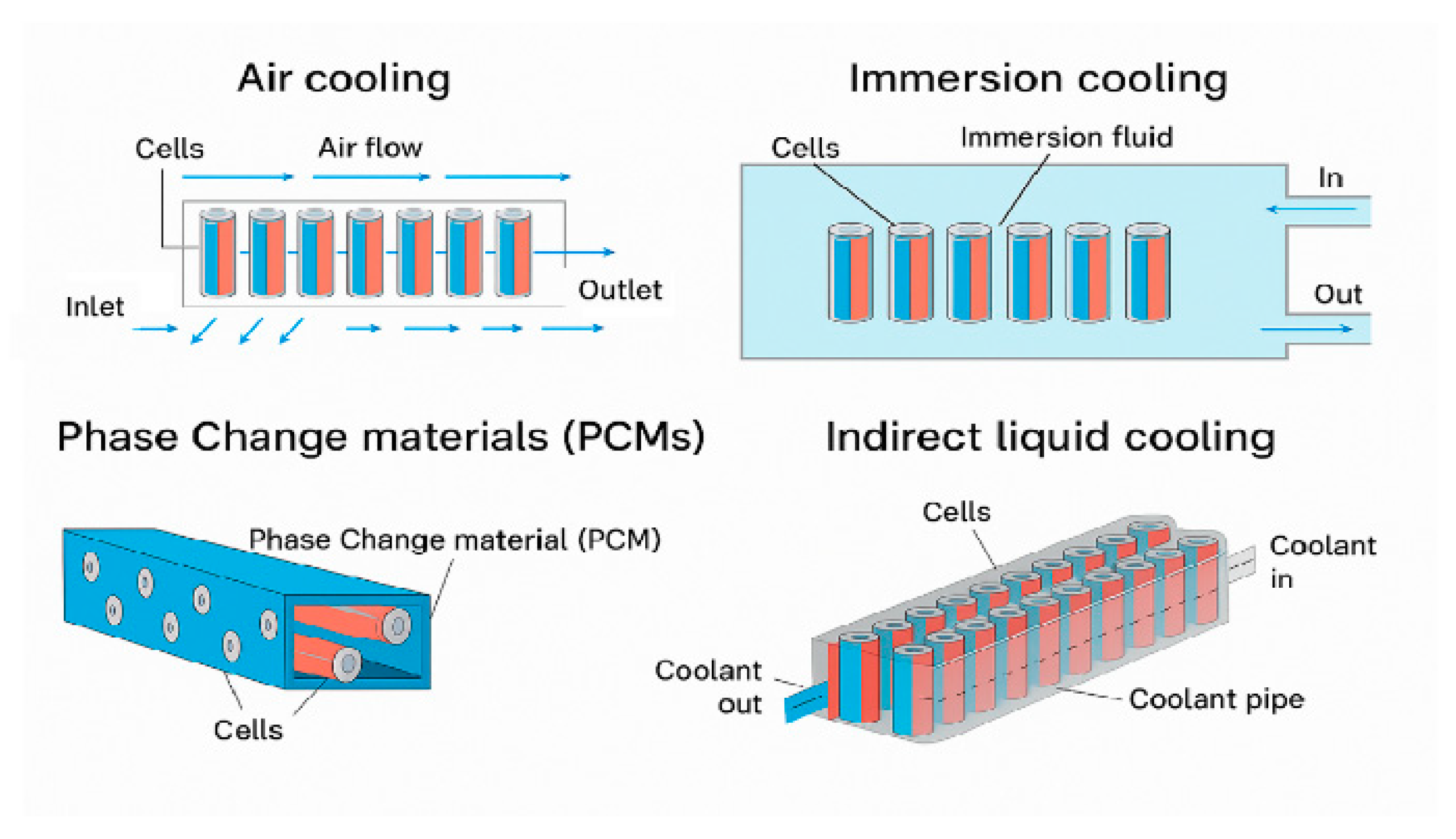 - Temperature sensors throughout the pack feed data to the BMS so it can maintain each of the cells in an optimal temperature range (often around 15–35 °C) [36,141]. Over-temperature conditions can lead to accelerated degradation or even thermal runaway, while low temperatures affect the pack’s performance. The BMS can activate cooling (e.g., pumps, fans) or heating systems to keep the battery within safe limits [108]. For example, if cells are getting too hot during fast charging or heavy use, the BMS will trigger cooling to prevent overheating. Thermal management is especially critical during fast charging when high current can rapidly heat the pack. Many EVs integrate BMS with a cooling loop or heat pump to enable features like battery pre-conditioning—warming up the battery before fast charging for optimal results [58,122].