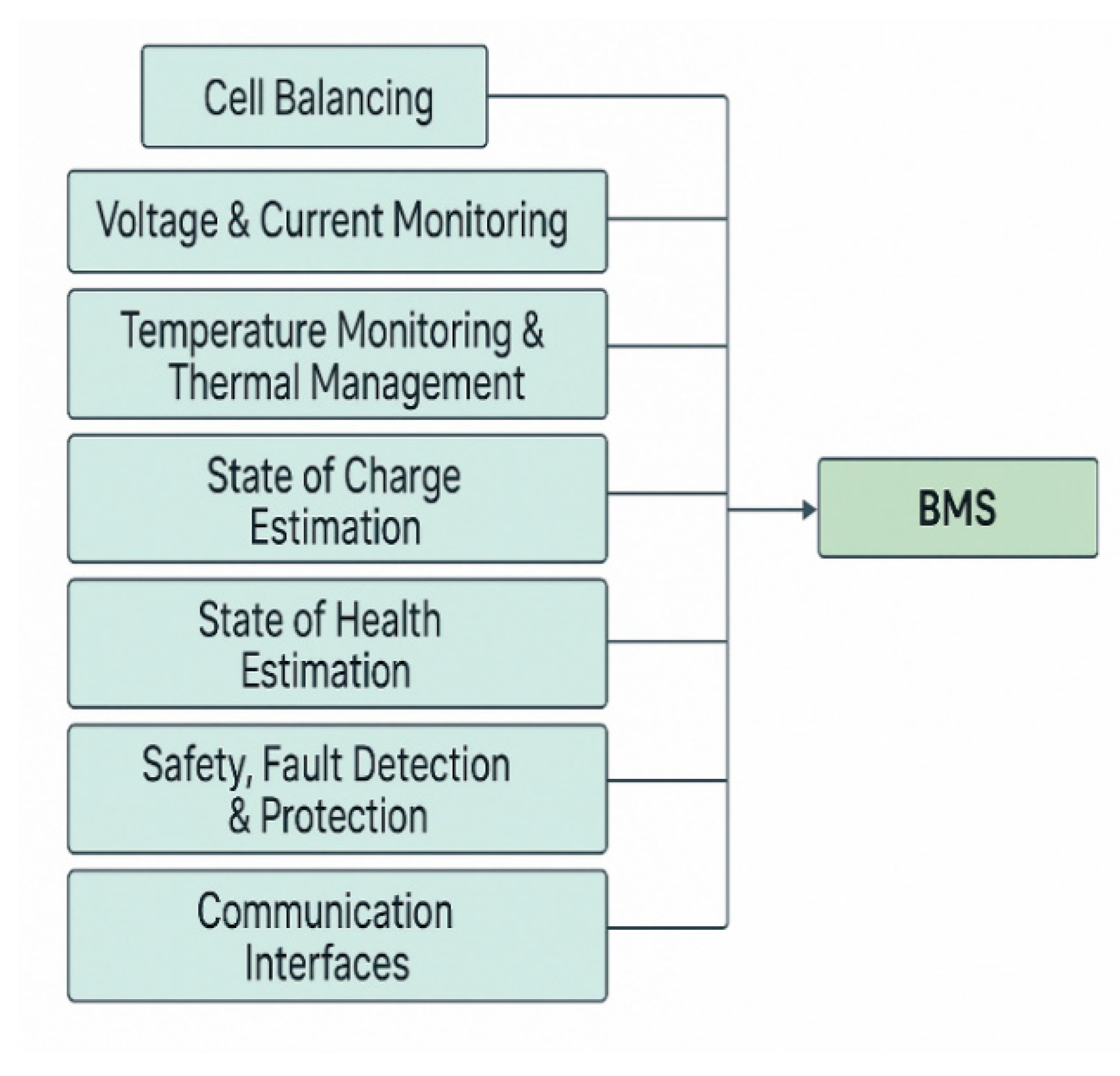 - The BMS measures the voltage of individual cells or groups of cells and keeps them within their safe voltage range (typically 3.0–4.2 V for Li-ion). The BMS prevents over-charge or over-discharge, which could damage the cells [142]. Monitoring current flow in and out of the pack allows tracking of charge/discharge rates and detecting abnormal spikes that may indicate faults. These real-time data are foundational for calculating state-of-charge (SOC) and state-of-health (SOH), ensuring each cell operates within specifications.