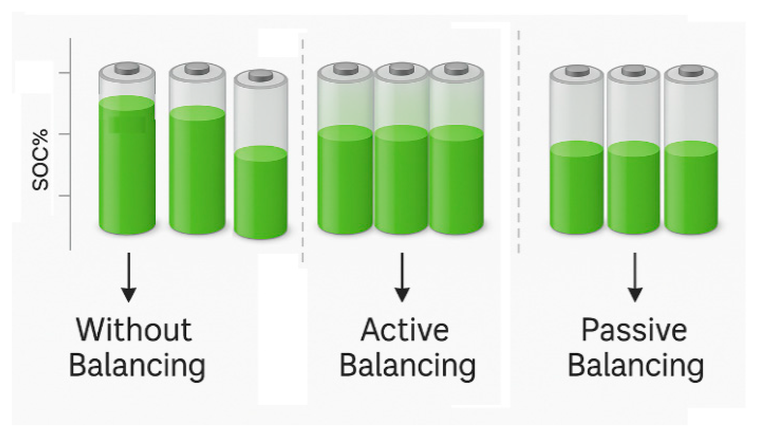 - In active balancing, the BMS redistributes energy from higher-charge cells to lower-charge ones (using capacitor or converter circuits), which is faster and more energy-efficient [143]. Figure 24 presents an explicit pictorial view of cell balancing in both active and passive modes. In active balancing, the charge is distributed equally among the cells, while in the passive mode, the cells take the level of the least charged cell. Active balancing can preserve more energy and potentially extend range, though it adds complexity.