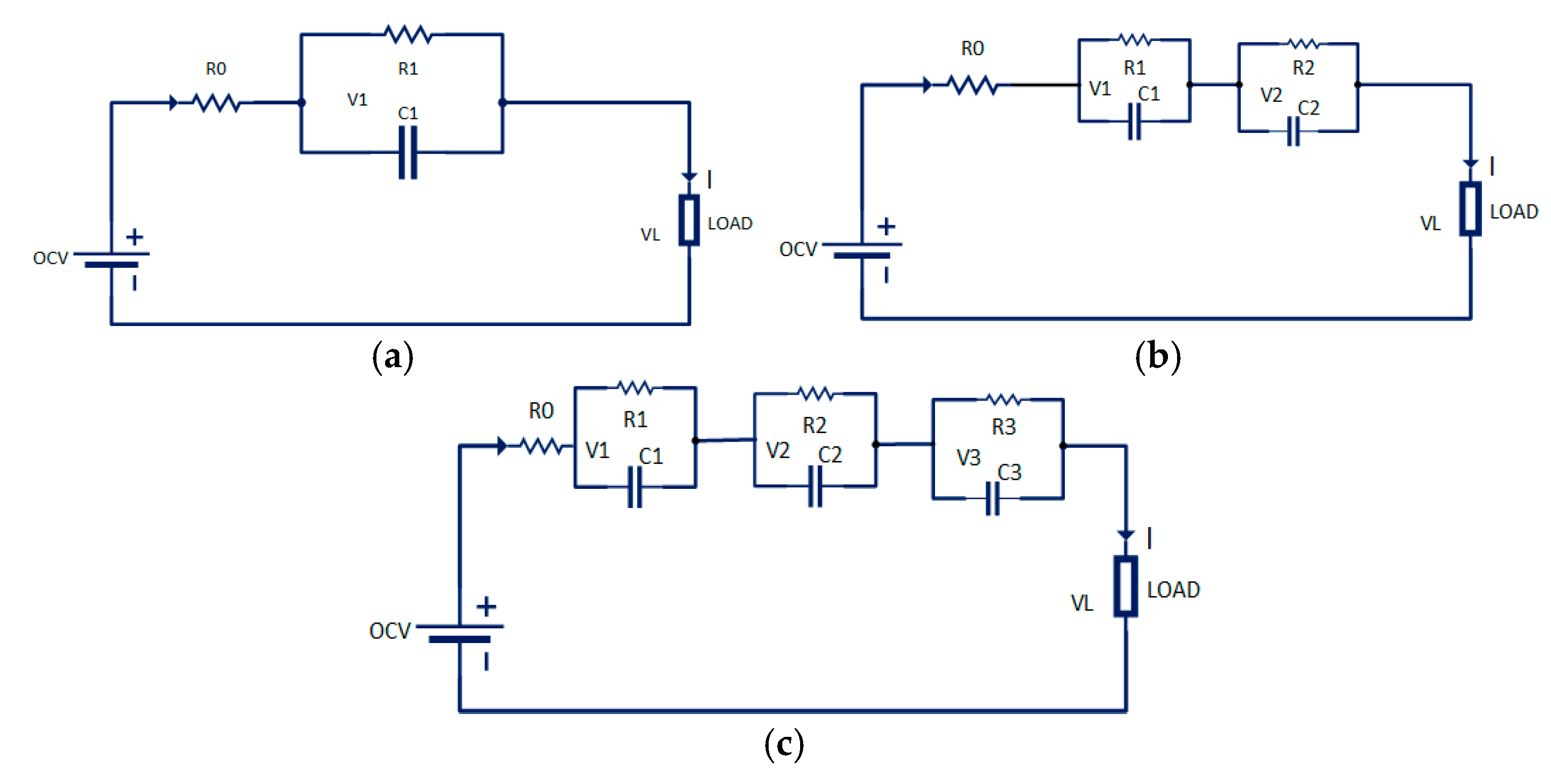 - These methods use mathematical models to simulate battery behavior and estimate SOC.Equivalent Circuit Model (ECM)—Models shown in Figure 27 the battery using resistors, capacitors, and voltage sources. Widely used due to simplicity and reasonable accuracy.Figure 27. (a) 1 RC, (b) 2 RC, and (c) 3RC Battery Equivalent Circuit Models. Figure 27 (a–c) Show Battery Equivalent circuit models (ECMs) that approximate battery behavior by resistor and capacitor combinations to capture its voltage dynamics.Figure 27. (a) 1 RC, (b) 2 RC, and (c) 3RC Battery Equivalent Circuit Models. Figure 27 (a–c) Show Battery Equivalent circuit models (ECMs) that approximate battery behavior by resistor and capacitor combinations to capture its voltage dynamics.