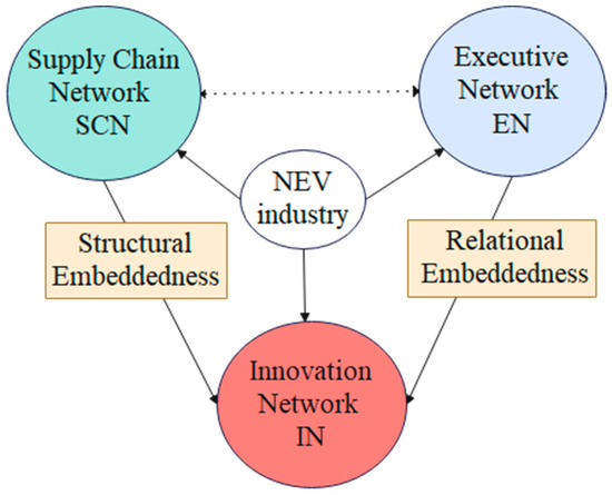 In the literature on the formation mechanisms of innovation networks, prior studies have predominantly focused on single-dimensional factors, such as industrial technological complementarity [7] or policy incentives [8]. Few have examined the phenomenon from a holistic perspective of cross-network embeddedness, leading to fragmented and unsystematic explanations of the structural characteristics of innovation networks. Given that innovation networks are inherently network-based in nature, it is crucial to construct and empirically measure the influence of other related networks on their formation. This necessity forms the core research motivation of the present study. Organizational institutionalism suggests that both formal and informal institutions shape organizational innovation behaviors [9]. Formal institutions govern innovation through codified rules and contractual arrangements, while informal institutions exert influence through social norms, trust, and interpersonal interactions. Likewise, network embeddedness theory [10] posits that external networks affect innovation networks via two distinct mechanisms: structural embeddedness, which captures the formalized positions and connections within a network, and relational embeddedness, which emphasizes the quality of interpersonal ties and trust-based exchanges. Integrating these perspectives within the new energy vehicle (NEV) industry context, we conceptualize a dual-network framework. Specifically, the supply chain network (SCN) embodies structural embeddedness, as it arises from formal contractual relationships among suppliers and manufacturers. In contrast, the executive network (EN) represents relational embeddedness, being shaped by executives’ social interactions and trust capital. We therefore argue that the formation and evolution of innovation networks in the NEV industry are jointly influenced by the interdependent dynamics of these two networks.
