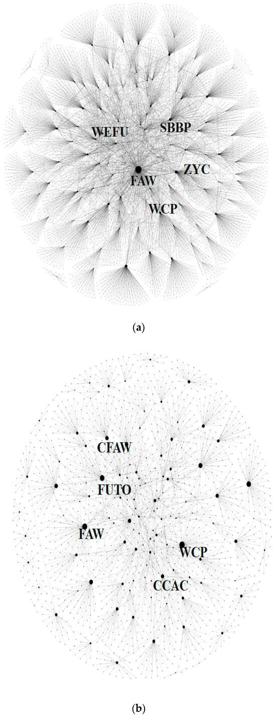 China FAW Co., Ltd. (CFAW) (Changchun, China), emerges as the largest hub node in Figure 2c, with its centrality metrics confirming its pivotal role in the NEV innovation ecosystem. This position is driven by two complementary factors: (1) technology leadership through its “Red Flag Innovation Ecosphere,” which integrates over 200 upstream and downstream partners to accelerate solid-state battery industrialization via industry-university-research alliances; and (2) policy–market synergy, as the firm leveraged its State-Owned enterprise status to secure “14th Five-Year” funding while achieving premium market penetration through strategic brand repositioning [59].