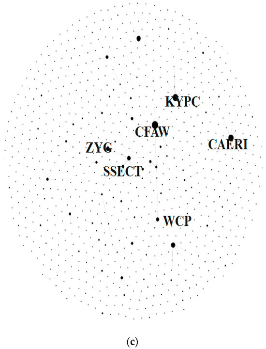 Global network analysis (Figure 2a–c) revealed distinct structural profiles, with visual patterns directly illustrating quantitative metrics and highlighting pivotal actors (see Table 3). The SCNs (Figure 2a) exhibit a low density (0.041) and a short average path length (2.846), visually manifested as a star-like topology with core manufacturers acting as central hubs, indicating efficient information flow and reflecting the modular architecture of the NEV industry. However, the dependence on a star-like topology poses a systemic risk, as the network may lack the redundancy to compensate for disruptions at key manufacturing hubs. The ENs (Figure 2b) exhibit a higher density (0.064) and clustering coefficient (0.365), corroborated by tightly knit subgroups that foster cohesive decision-making communities. However, the longer average path length (3.822) reflects noticeable gaps between clusters, suggesting the presence of hierarchical governance. In contrast, the innovation network (Figure 2c) displays a dynamic and interconnected architecture, characterized by densely linked hubs that bridge distant nodes. The visual lack of modular boundaries, along with metrics such as structural hole bridging, underscores its role in facilitating rapid knowledge diffusion and technological breakthroughs.