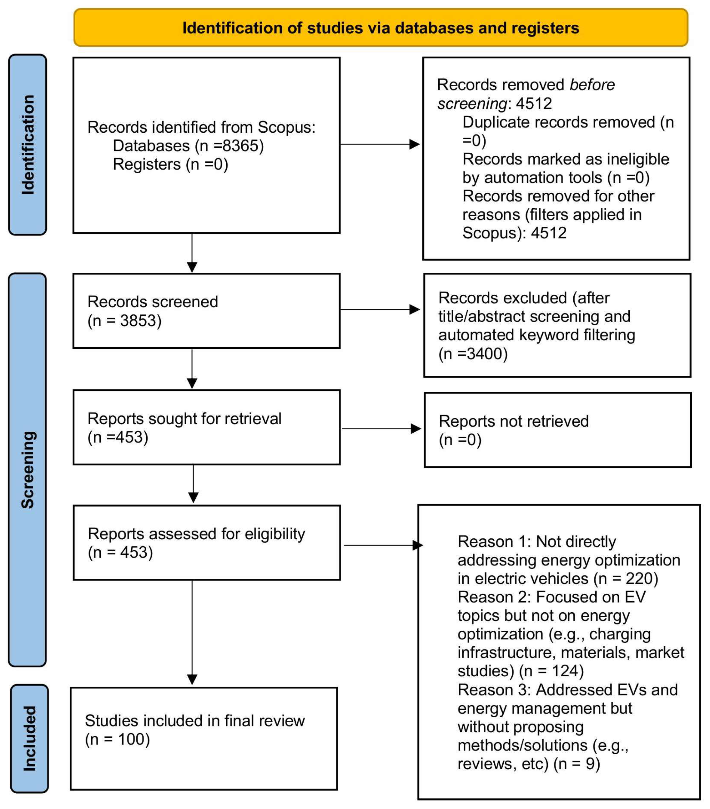 Screening of titles and abstracts | Manual review to exclude articles not addressing energy optimization in electric vehicles | To retain only studies with direct relevance to the research objective |