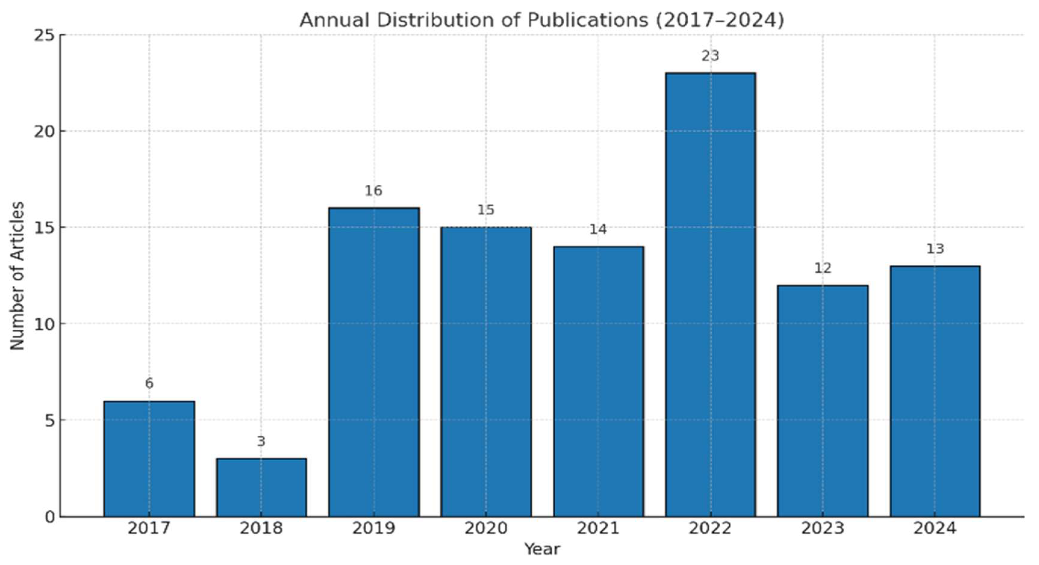 3.1.1. Overview of the Analyzed Corpus: Annual Distribution of Publications (2017–2024)