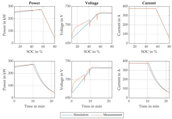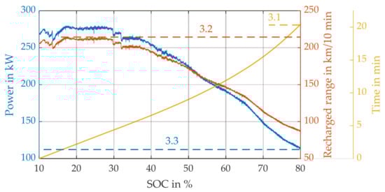Lastly, charging metrics are used to define the charging behavior of the vehicle. The maneuver here is a DC charging process using the maximum available power defined in the standard Combined Charging System (CCS) [,]. The metrics include DC charging time from 10 to 80% SOC and max. recharged range in 10 min regarding the WLTC range and consumption. An alternative to the latter metric would be the maximum charging power. In addition to the charging metrics presented in [], it is essential to consider another metric, namely, the residual charging power at 80% SOC.