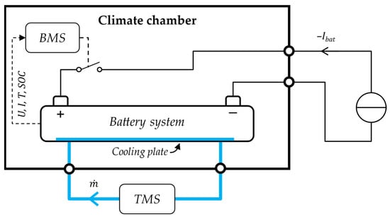 Cell 1 is further measured at system level using a battery pack test bench (Figure 3), which, in addition to the others, is able to control the battery current up to 400 A. Similar test setups were used in [,,,]. From the battery’s perspective, the current Ibat for charging is negative, which is controlled by a current source. In addition to the others, the BMS decides based on the measurement of voltage U, current I, temperature T, and SOC if the main switch is opened or closed. The battery’s environment in the climate chamber and the battery itself can be tempered via the cooling plate by a thermal management system (TMS), which controls the mass flowrate and its temperature. The goal of this is to analyze the general battery behavior, compare it to the cell simulation models, and validate the method. Therefore, OCV and internal resistance are additionally measured, both on system level. Furthermore, the defined method is applied for this battery using the test bench in Section 3.2.