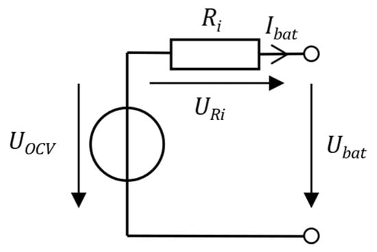 The basic model is displayed in Figure 4. Here, the OCV is and the voltage over the resistor is . equals the battery’s internal resistance. The battery voltage is given by Equation (1) and the battery current by Equation (2). The charged or discharged power POCV is calculated by Equation (3) and the terminal power Pbat by Equation (4):