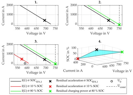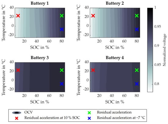 The OCV is first analyzed. Figure 5 presents the OCV maps for each battery listed in Table 6, showing their dependency on SOC and temperature. These maps were gathered from a validated simulation model, which was parameterized based on the cell data provided by the respective battery suppliers. The model consists of an ohmic resistance with three RC elements connected in series, as previously applied in [,], and serves as the reference for this analysis. The voltage of the OCV maps is normalized to their upper cut-off voltage. The operating points for the three metrics of residual acceleration are also shown.