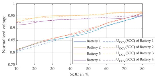 Using the test bench from Figure 3, two OCV measurements were conducted at 23 °C and −7 °C. Both are displayed in Figure A1. The charging process at −7 °C was stopped periodically in order to hold the temperature as the battery warms up because of its internal resistance while charging. With R > 0.999 and RMSE < 0.002 normalized voltage, it can be concluded that the temperature dependency is neglectable in the concept phase.