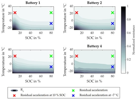 Second, the battery’s internal resistance Ri is analyzed. This is conducted in a similar manner as for OCV. Figure 7 shows the normalized internal resistance for the batteries of Table 6, dependent on SOC and temperature. Similarly to OCV, these maps were gathered from a validated simulation model, which was parameterized based on the cell data provided by the respective supplier. The model consists of an ohmic resistance with three RC elements connected in series as previously applied in [,], and serves as the reference for this analysis. The normalization is performed by using the maximum resistance. Battery dynamics or a differentiation for charging and discharging is not considered here. In Figure 7, the sum of the ohmic resistance and the three resistors of the RC elements was used. The operating points for the three metrics of residual acceleration are also shown.