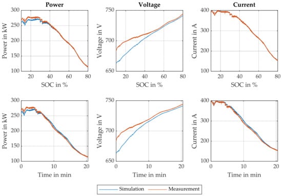 To assess the limitations of the model used in the proposed method, the validated reference simulation model for battery 1 was employed. As described in Section 3, the reference model includes an ohmic resistance and three RC elements in series. All components are dependent on both SOC and temperature (see Figure 5 and Figure 7). Additionally, the model incorporates validated virtual black-box representations of both BMS and TMS.