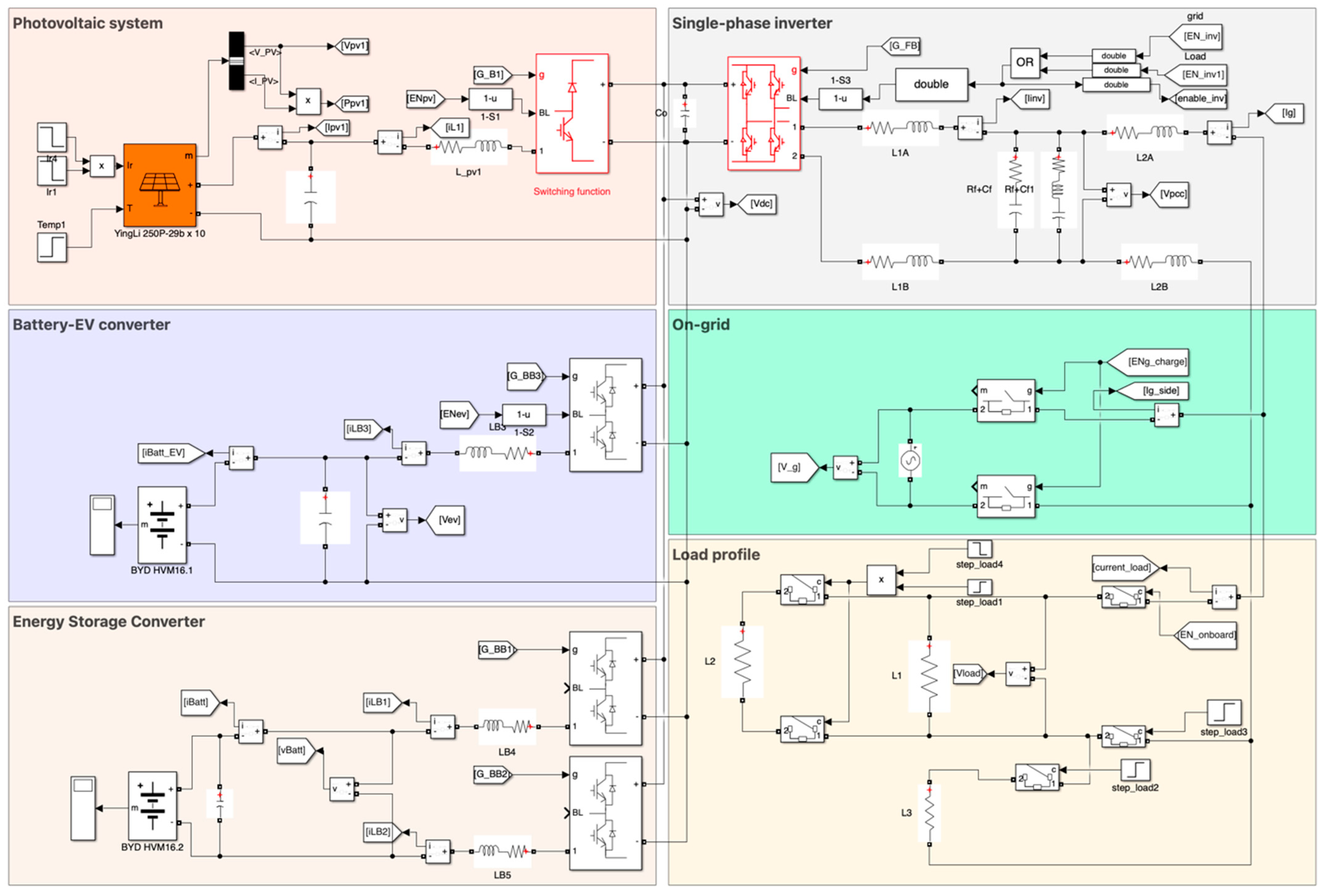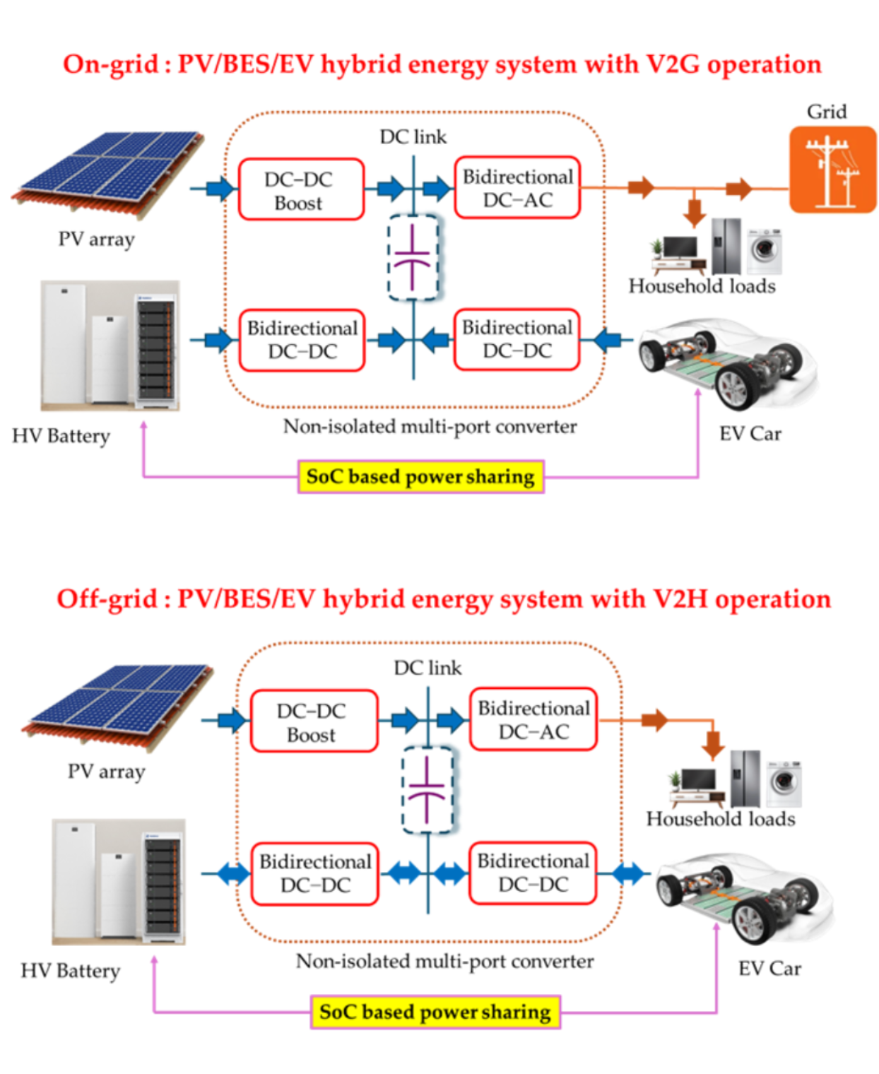 - Design of a novel four-port topology tailored for PV/BES/EV hybrid systems with V2G and V2H functionalities, to support both on-grid and off-grid operations.