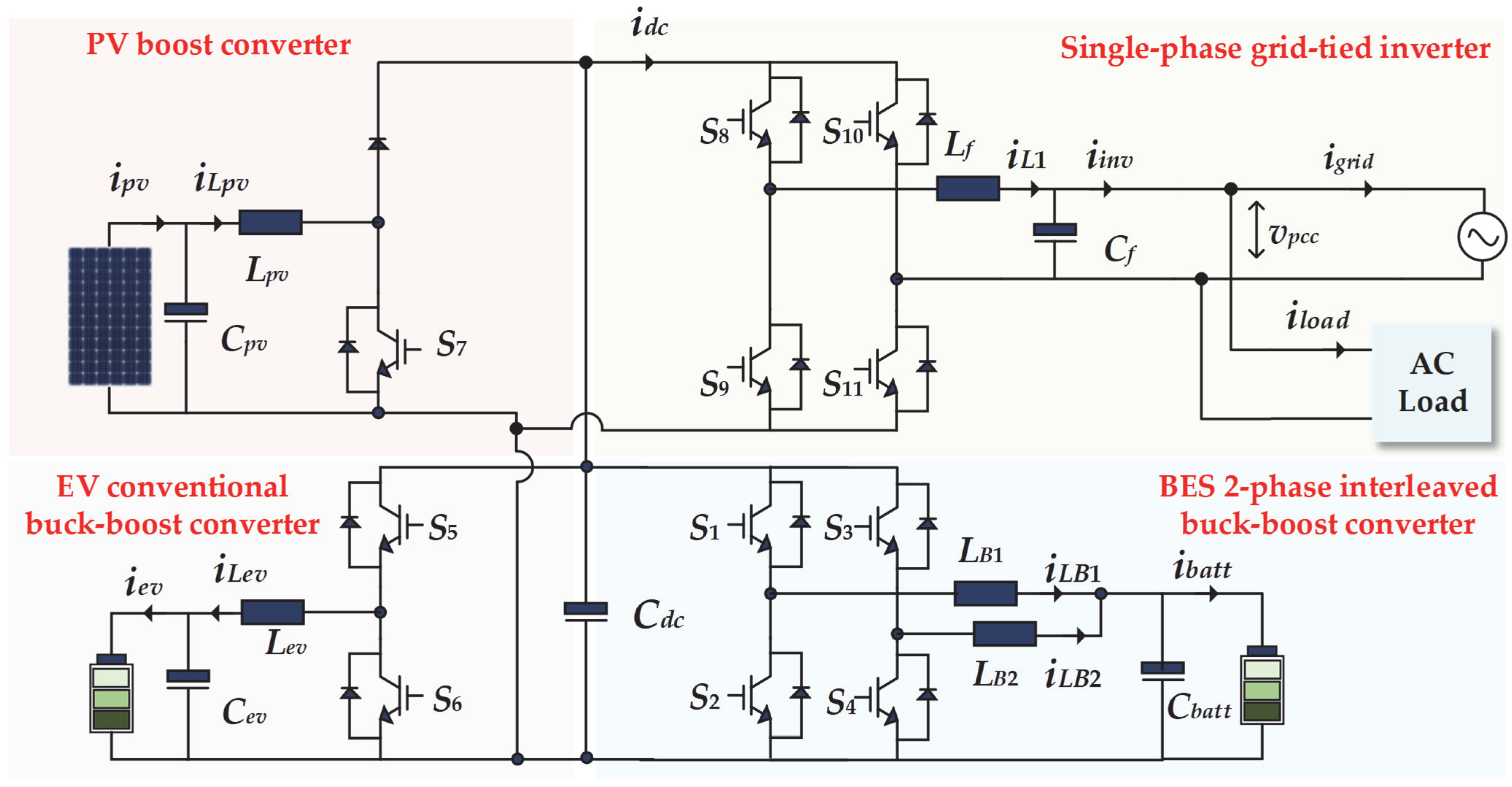 Architecture | Transformer-based seven-level cascade H bridge bidirectional DC-AC converter, buck–boost bidirectional DC–DC converters (BES, EV), diode replaces PV boost stage; galvanic isolation included | Non-isolated dedicated four-port: no galvanic isolation; a simple H bridge bidirectional DC-AC converter, interleaved bidirectional DC-DC converter (BES), buck–boost bidirectional DC-DC converter (EV), boost PV converter |