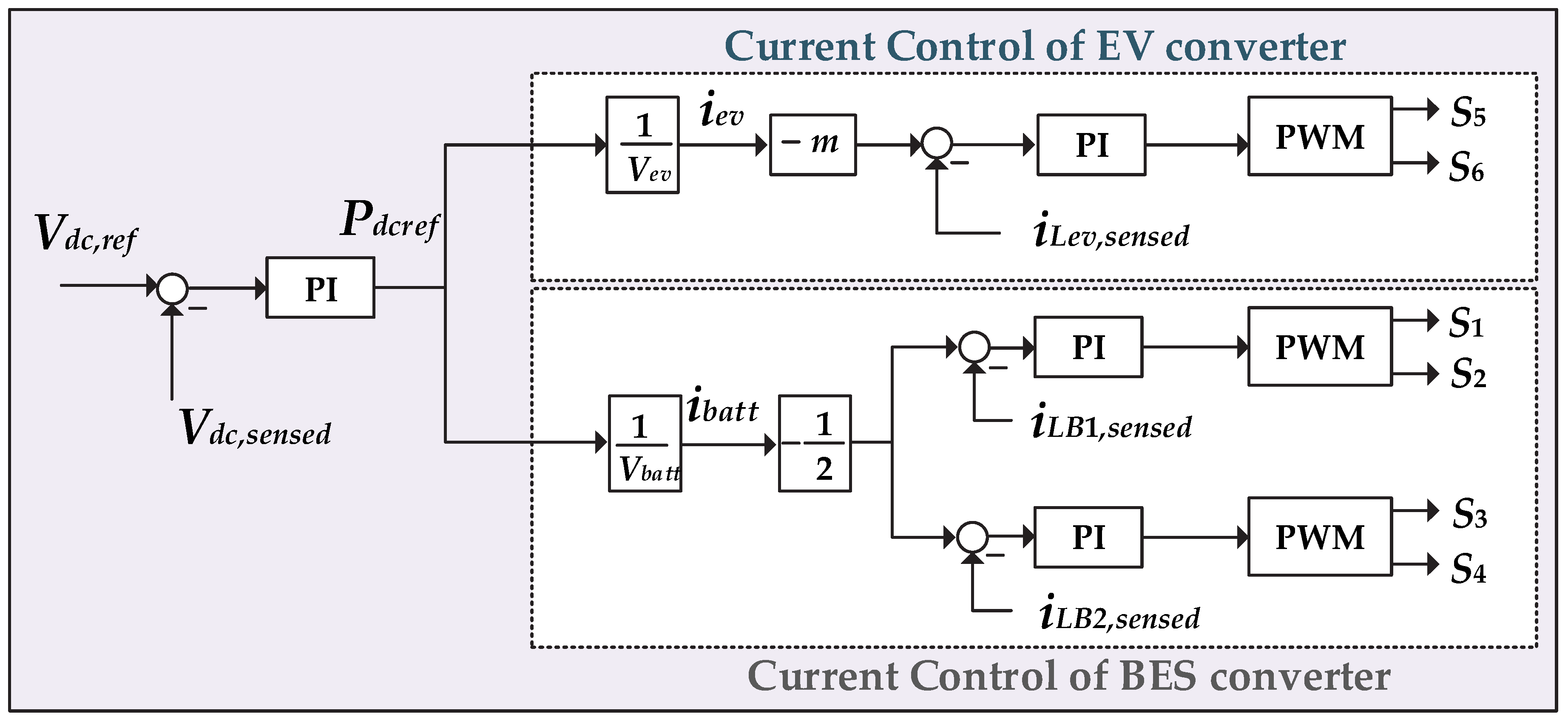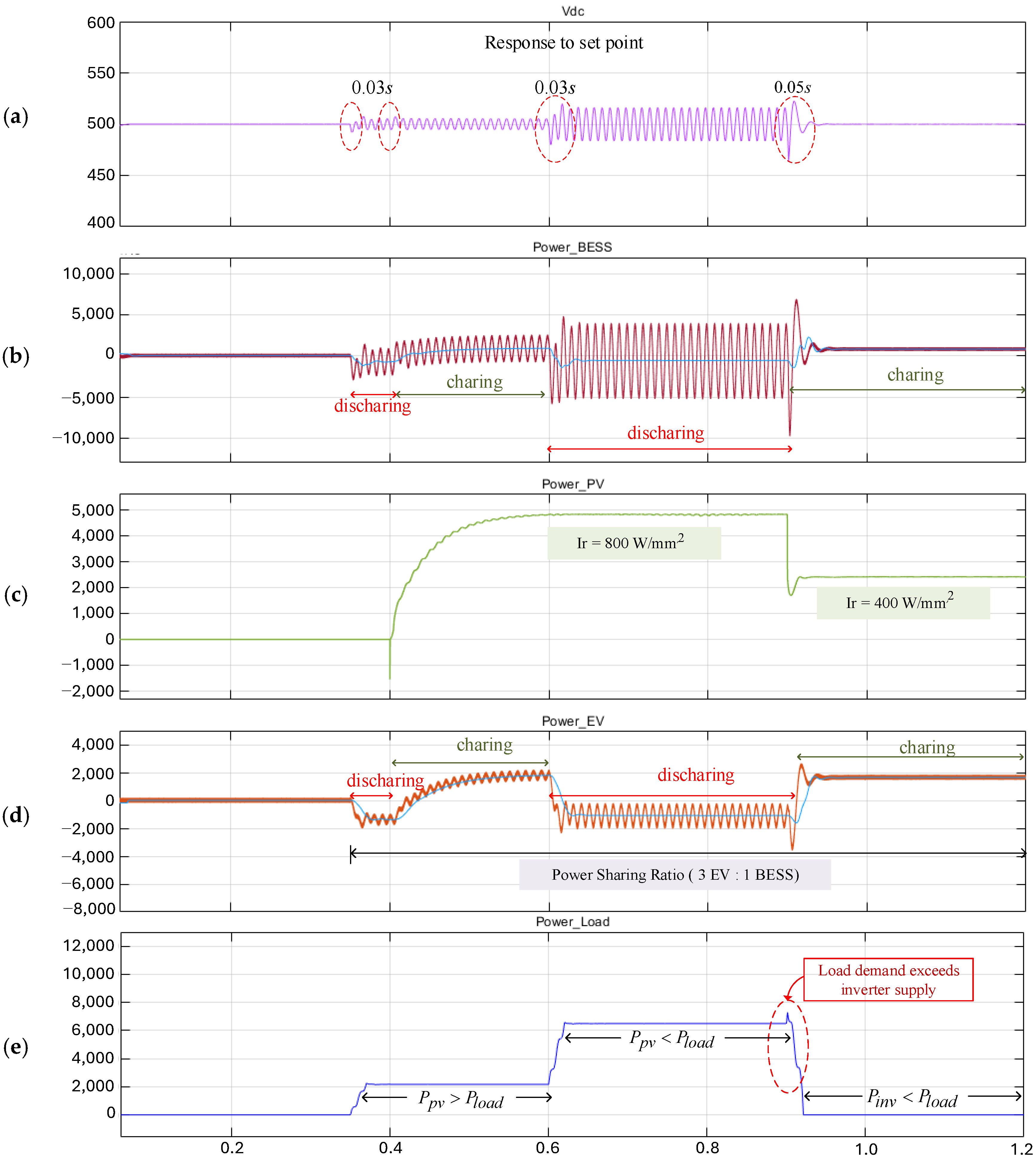 - If the , the BES and EV assist the power injection to the local load, based on the power-sharing ratio in Table 1. In contrast, BES and EV absorb the surplus power from the PV generation, if and BES are not yet fully charged.