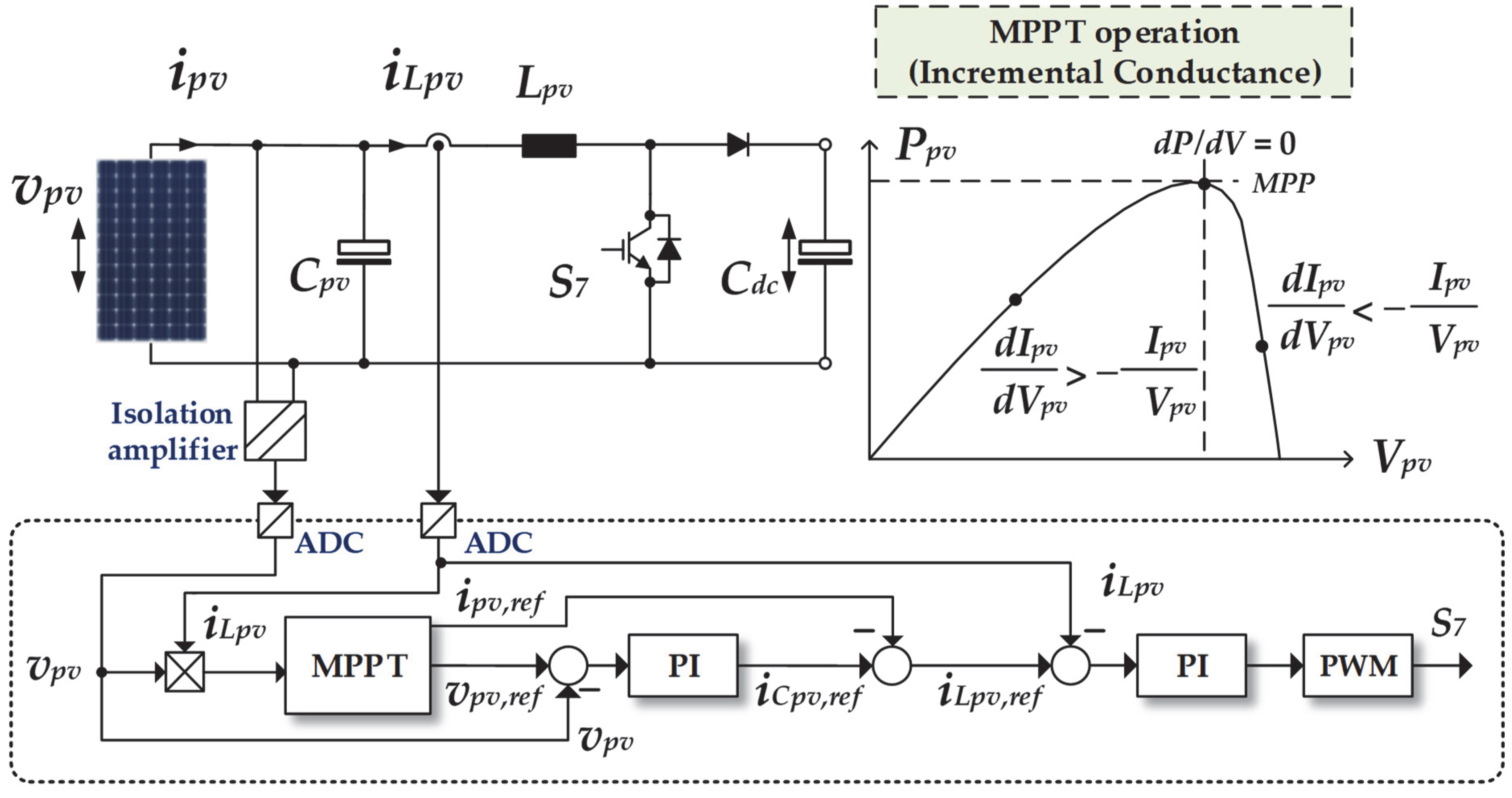 - The capacity of the DC-DC boost converter is 6 kW. The nominal PV voltage is 400 V. At the PV side, the capacitance is 50 μF and the inductance is 2 mH. The PI parameters of voltage control loop are = 1.3329 and = 0.0178, while the current control loop consists of = 0.1633 and = 0.0136. The switching frequency is 20 kHz.