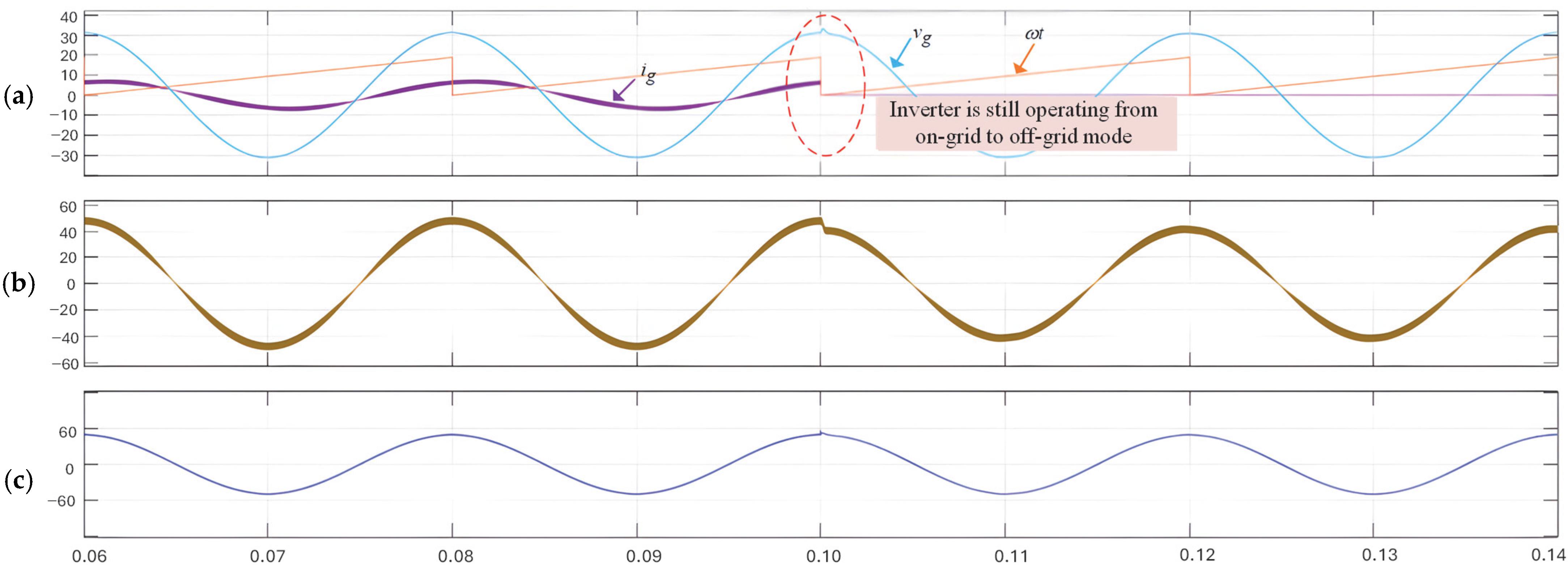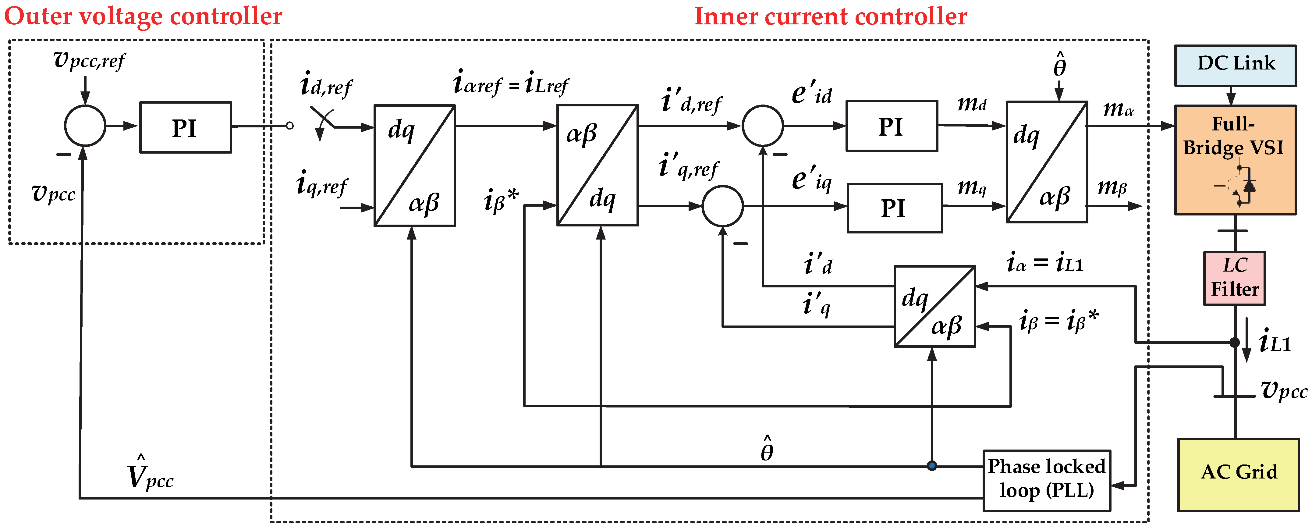 - The grid-tied DC-AC full-bridge inverter has a rated capacity of 7.5 kW. The LC filter consists of 1 mH and 20 μF, the PI parameters of voltage control loop are = 0.3732 and = 0.0223, while the current control loop consists of = 0.6732 and = 0.0235. The switching frequency is 20 kHz. Moreover, the PI parameters of the PLL are= 0.4082 and = 0.0011, and the low pass filter time constant, , is 0.0032 s.