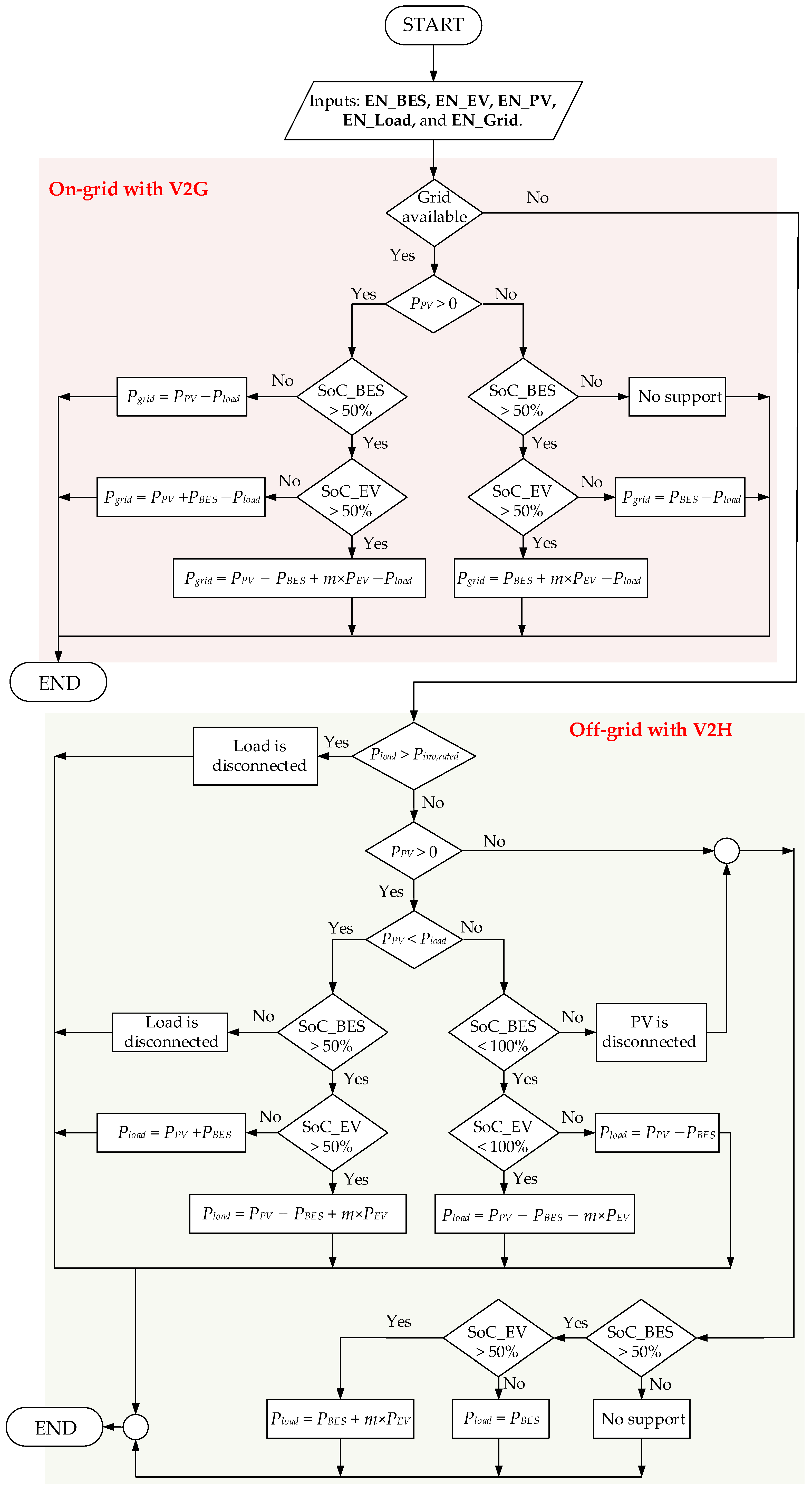- 50% > SoC_EV: The system does not allow the EV to discharge power, while the V2G or V2H function is disabled, preserving the EV’s battery for other uses.