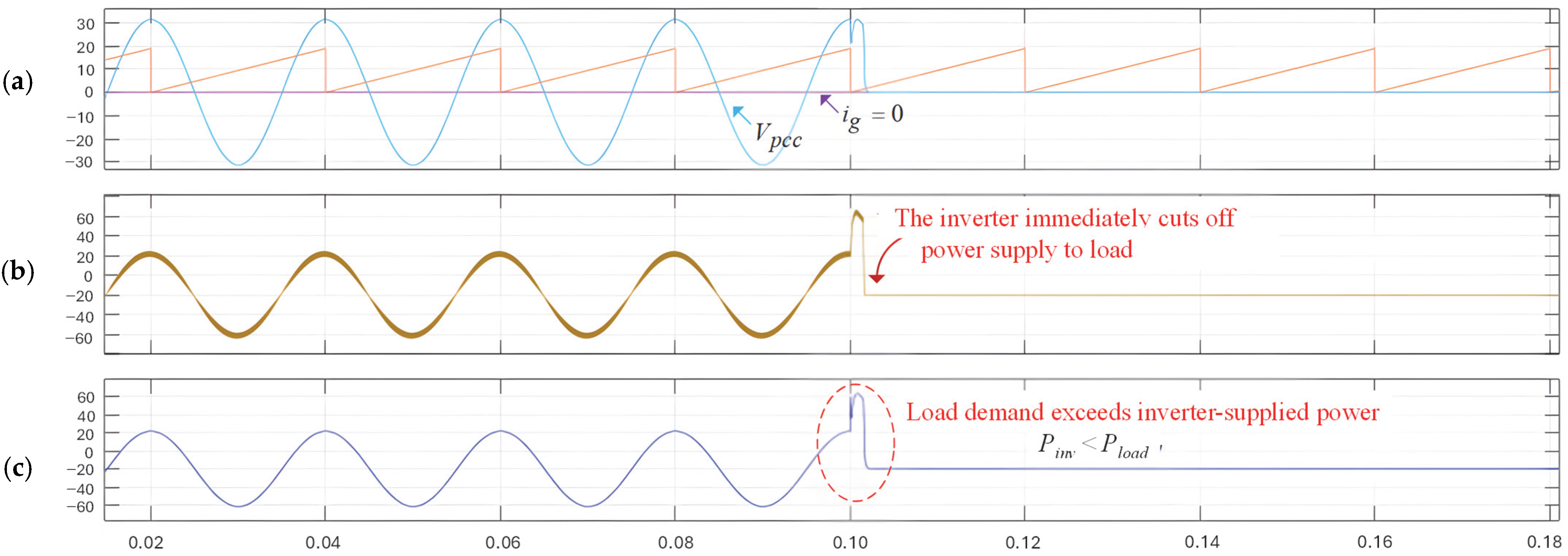 0.9 s | PV generation drops rapidly to 2.5 kW, while the load demand is stepped up to exceed the inverter’s rated capacity (>7.5 kW). The load is immediately disconnected, and PV power is then used to charge EV and BES batteries. |