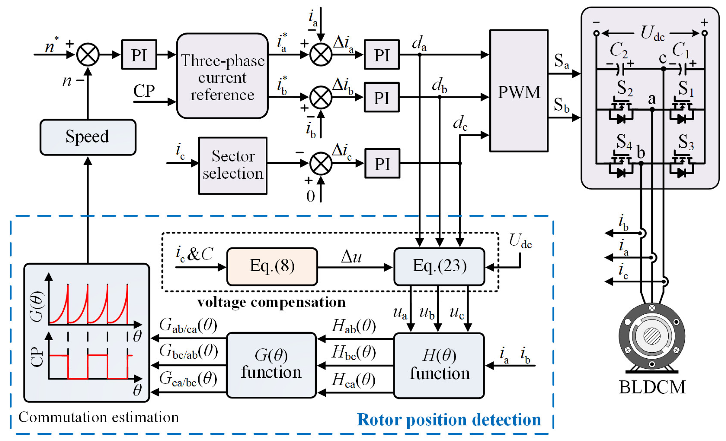 - Jin, H.; Liu, G.; Zheng, S.Q. Commutation error closed-loop correction method for sensorless BLDC motor using hardware-based floating phase back-EMF integration. IEEE Trans. Ind. Inform. 2022, 18, 3978–3986. [Google Scholar] [CrossRef]