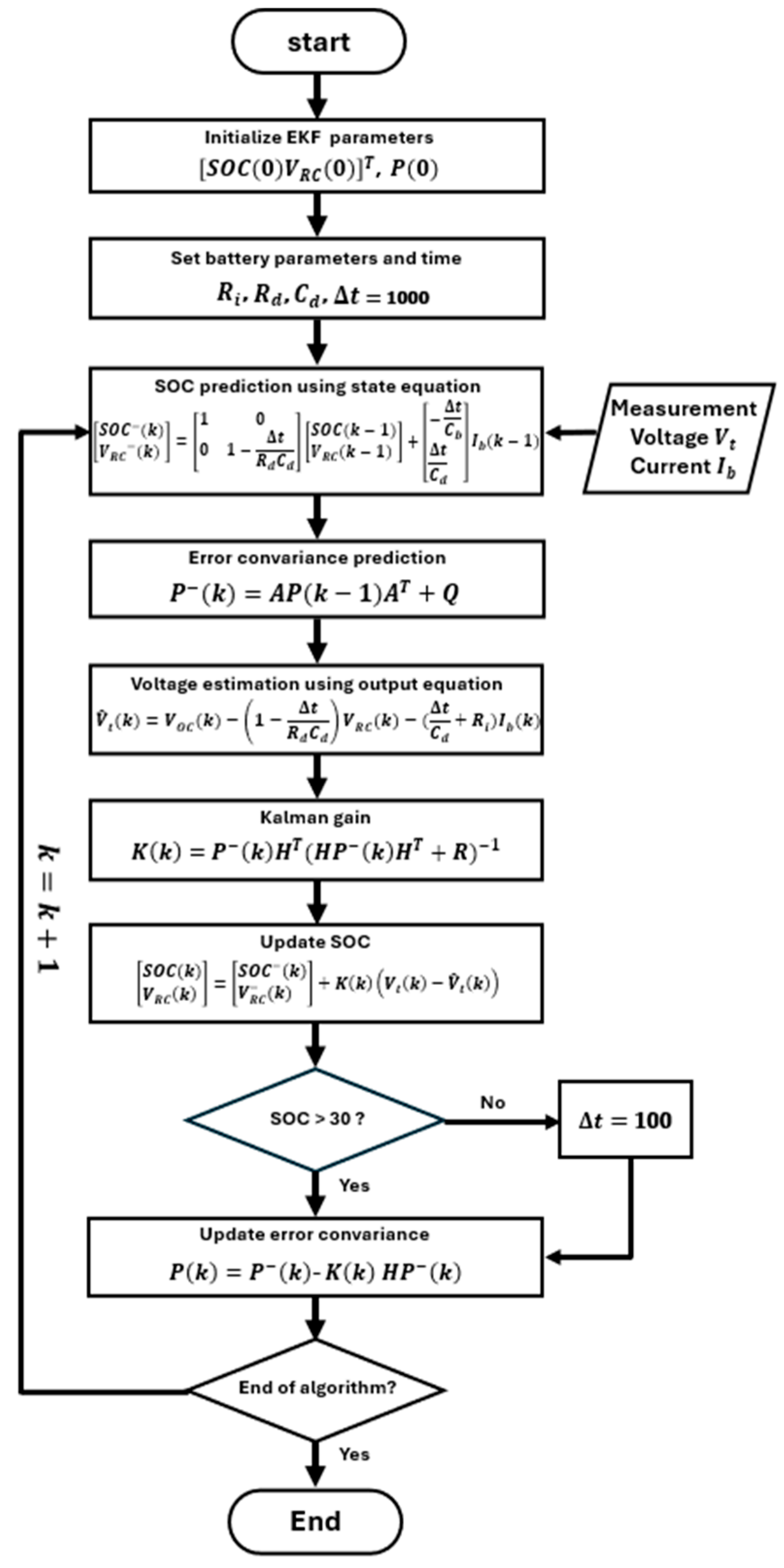 - Yun, J.; Choi, Y.; Lee, J.; Choi, S.; Shin, C. State-of-charge estimation method for lithium-ion batteries using extended Kalman filter with adaptive battery parameters. IEEE Access 2023, 11, 90901–90915. [Google Scholar] [CrossRef]