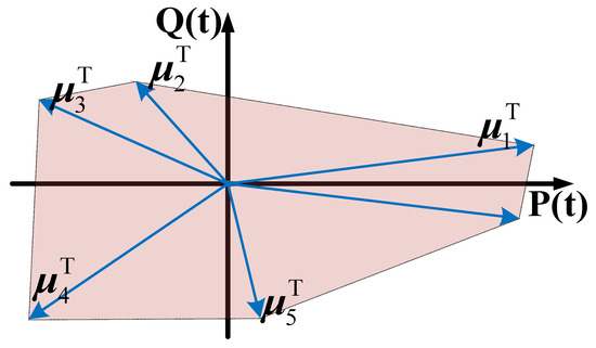 At present, the main approaches for characterizing the feasible region of a VPP include the Minkowski sum method and the vertex search method. Given the heterogeneity of massive distributed resources aggregated within a VPP, and the need to impose distribution network power flow constraints when equivalently connected to the 220 kV bus in this study, the Minkowski sum method is unable to accurately characterize the VPP’s equivalent feasible region at the 220 kV bus. Therefore, this paper adopts the vertex search method to delineate the boundary of the VPP’s equivalent feasible region, as expressed in (2). The principle of the vertex search method is illustrated in Figure 1.
