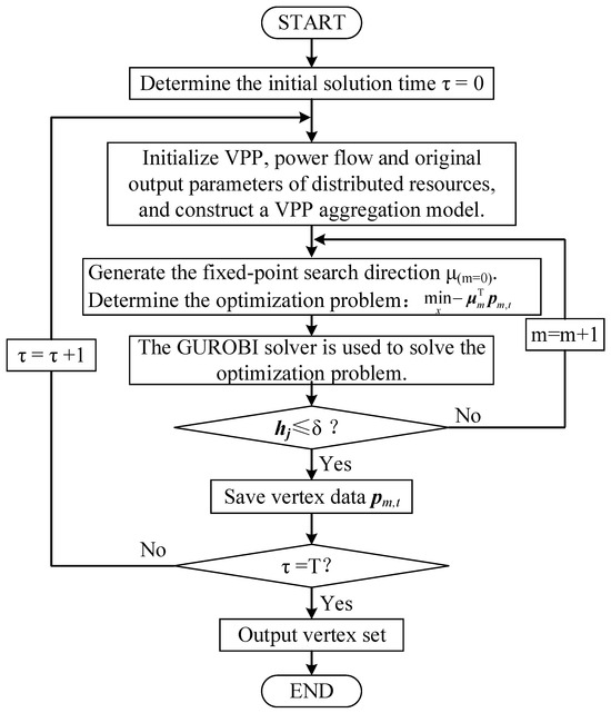 This paper adopts the vertex search method to transform the VPP feasible region construction problem into an optimization problem for the VPP’s external power output. This allows for the iterative solution of the VPP’s output boundaries using the GUROBI solver [27]. The flowchart for solving the VPP feasible region based on the vertex search method is shown in Figure 2.