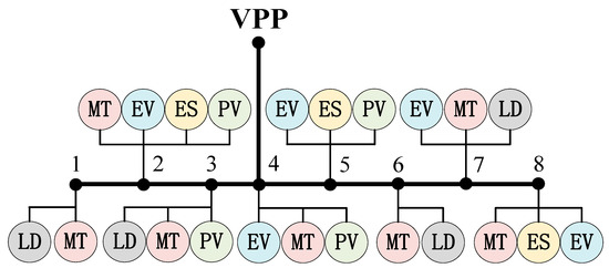 The VPP aggregation model developed in this paper includes distributed resources such as distributed photovoltaics (PV), distributed gas turbines, energy storage, electric vehicle (EV) charging stations, and controllable loads. The connection points for these resources are shown in Figure 5. The related parameters of distributed energy storage and gas turbines are shown in Table 3.