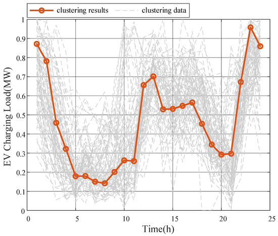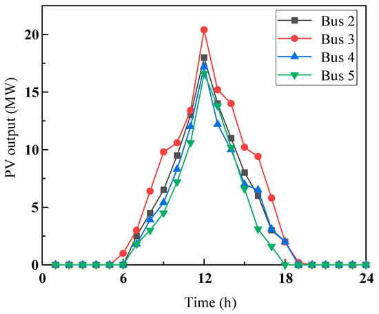 The forecasted output of the distributed PV and the loads from EV charging stations are shown in Figure 6 and Figure 7.