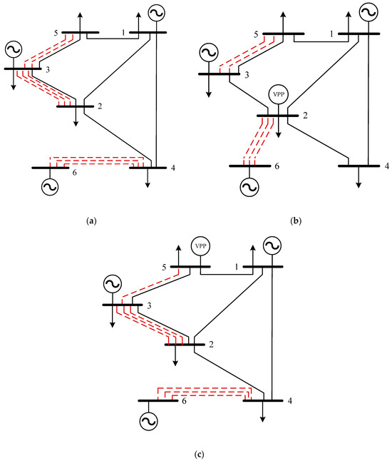 Comparison of TNEP schemes under different scenarios for the Garver-6 system. (a) TNEP scheme without considering VPP feasible region; (b) TNEP scheme considering the VPP feasible region at Bus 2; (c) TNEP scheme considering the VPP feasible region at Bus 5.