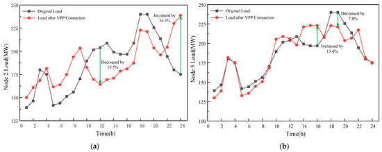 Load comparison before and after considering the VPP feasible region at different nodes: (a) load at node 2 before and after considering the VPP feasible region; (b) load at node 5 before and after considering the VPP feasible region.