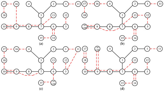 Comparison of TNEP schemes under different scenarios for the Garver-18 system. (a) TNEP scheme without considering VPP feasible region; (b) TNEP scheme considering the VPP feasible region at Bus 10; (c) TNEP scheme considering the VPP feasible region at Bus 14; (d) TNEP scheme considering the VPP feasible region at Bus 16.