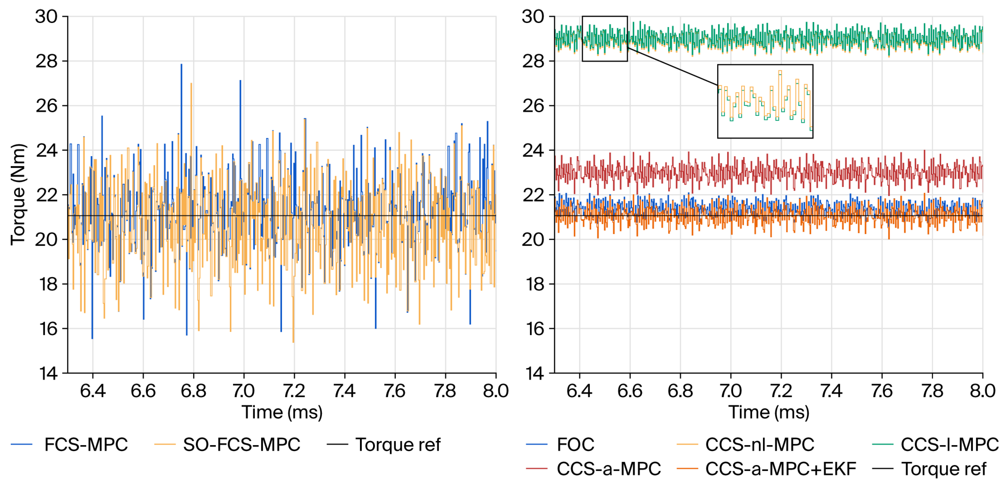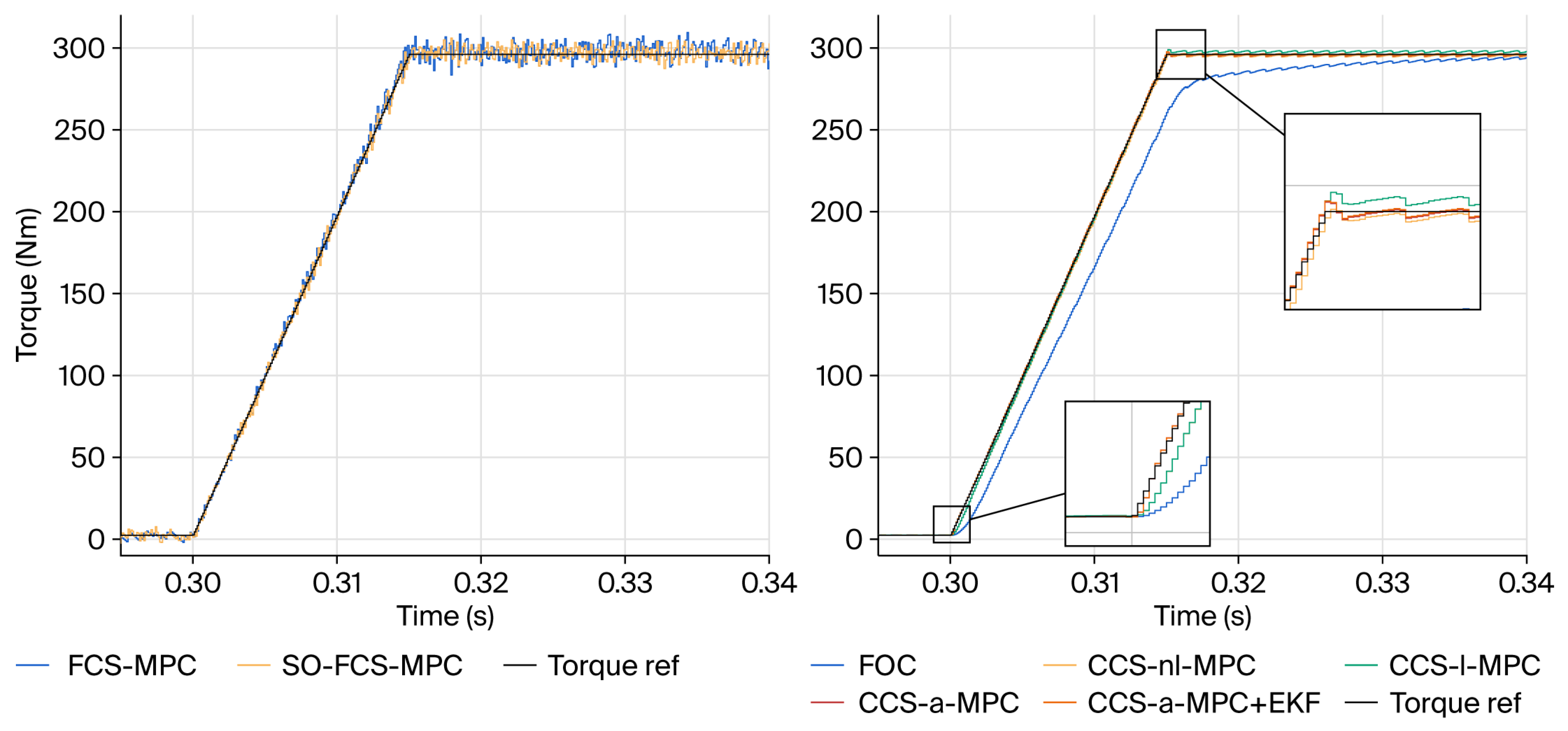 This paper investigated the effectiveness of different MPC strategies for controlling IPMSMs in BEV and PHEV traction applications, especially in comparison with FOC, the current industry benchmark. If the various MPCs considered in this study tend to perform better than FOC notably in terms of dynamic response, it is at the expense of increased control complexity. There are also important variations in the results among the different types of MPC.