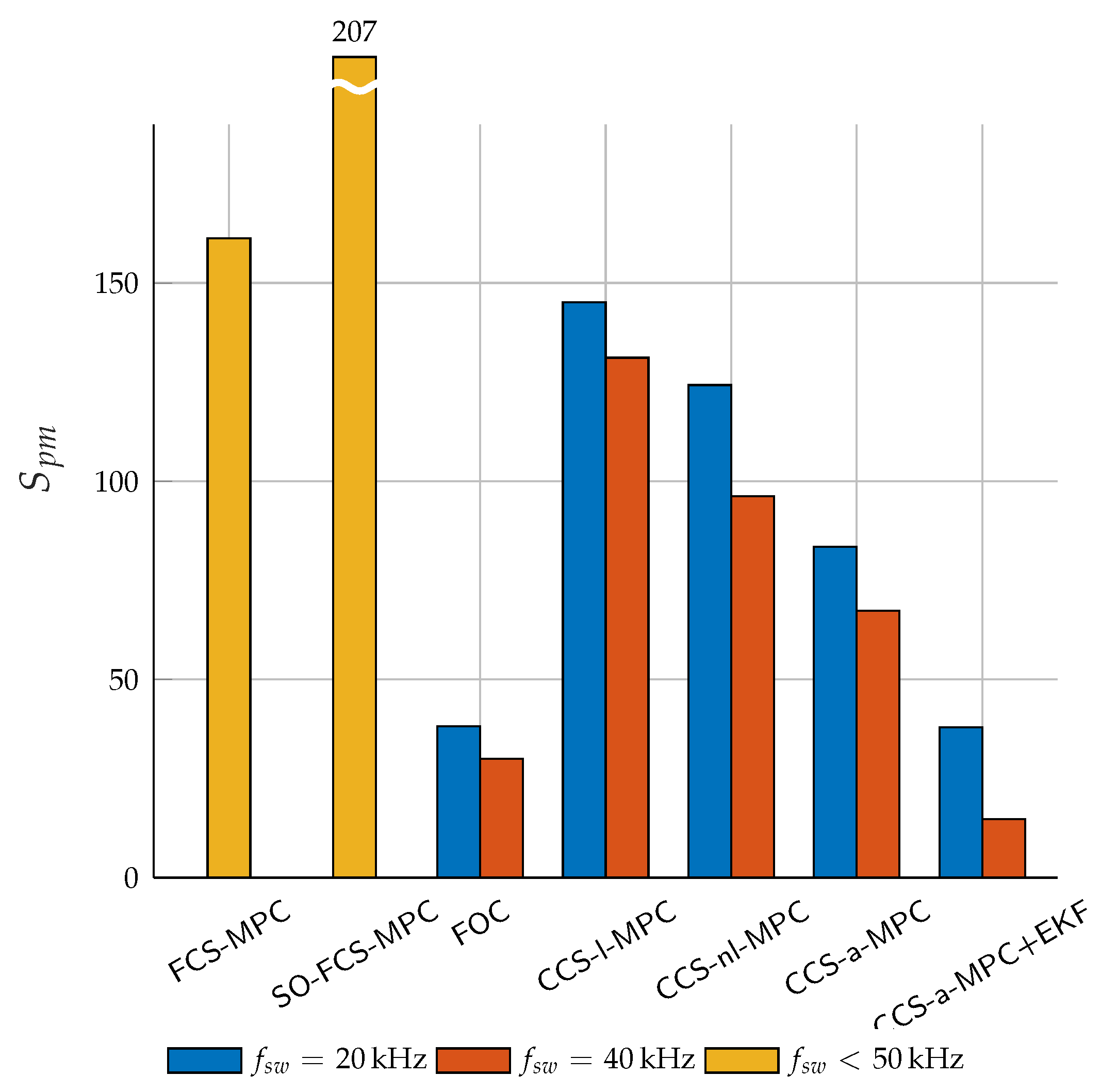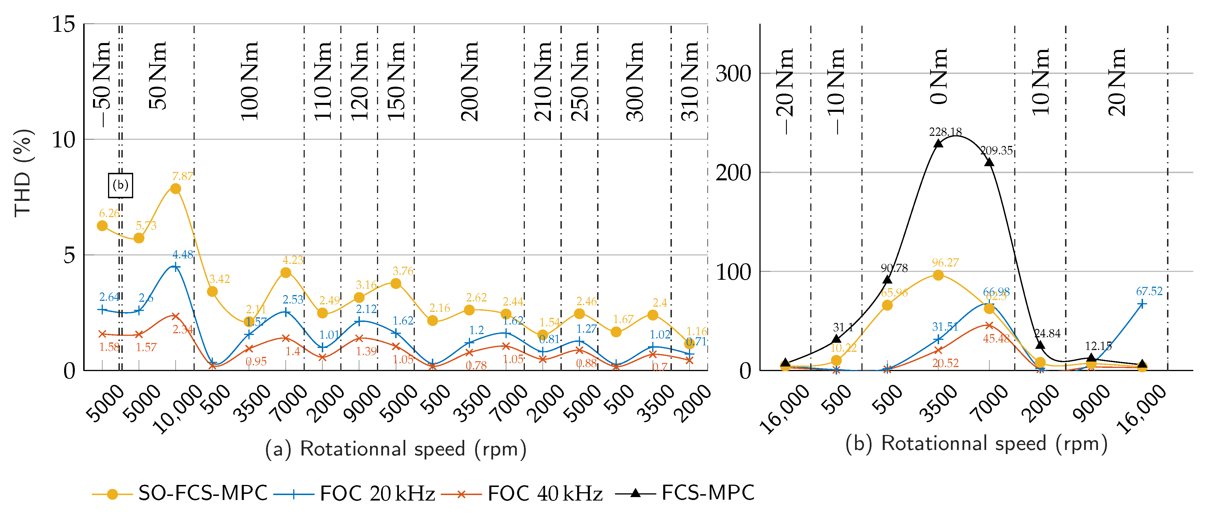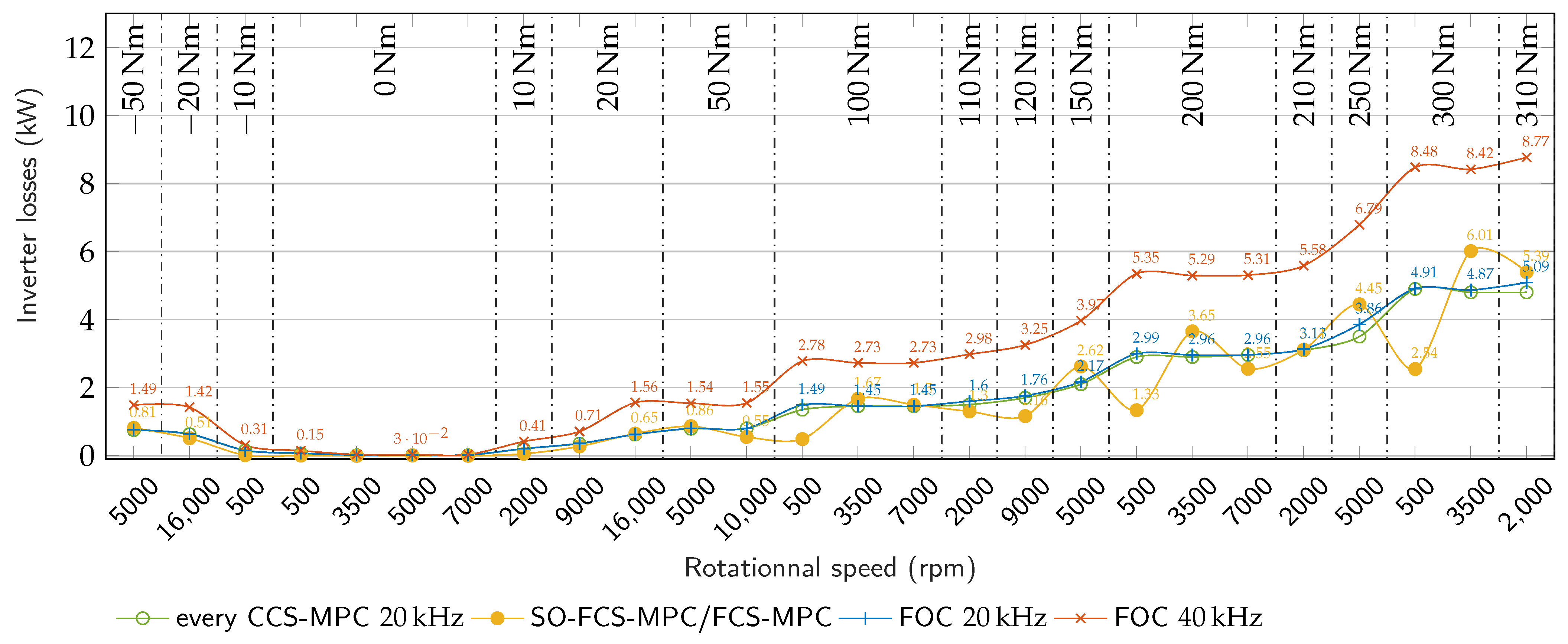 On the other hand, when considering global losses, SO-FCS-MPC has the best results. While slightly degrading the THD, SO-FCS-MPC significantly improves inverter losses. Therefore, a legitimate interest still remains by extending direct MPC controllers with a parameter estimator for better quality (e.g., to reduce the level of torque ripple) and increased robustness. This will be further investigated in future work on the basis of the introduced SO-FCS-MPC. The full ACU implementation of SO-FCS-MPC with an estimator and CCS-a-MPC+EKF are therefore planned to verify practical control efficiency and real-time ability. Concerning CCS-a-MPC+EKF, other techniques of parameter estimation will also be explored instead of the Extended Kalman Filter (e.g., neural networks) to improve processing complexity.