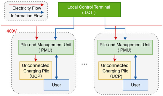 As illustrated in Figure 1, the dotted box represents a retrofitting unit, which encompasses an existing UCP, its user, and the newly added Pile-end Management Unit (PMU). PMUs are additionally deployed outside UCPs. Specifically, PMUs are installed either at the input or output terminals of the user’s distribution cabinet connected to the charging pile.