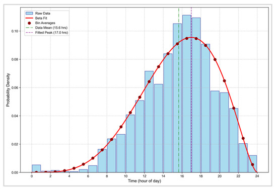 Due to the lack of a remote power control function in UCPs, for the sake of convenience, residential users generally start charging immediately upon arriving at home. Therefore, it is considered that the time at which the EV user returns home is the time at which the EV starts charging. Based on the statistics of NHTS 2022, this time follows a beta distribution which is shown in Figure 2. Its probability density function can be expressed as follows: