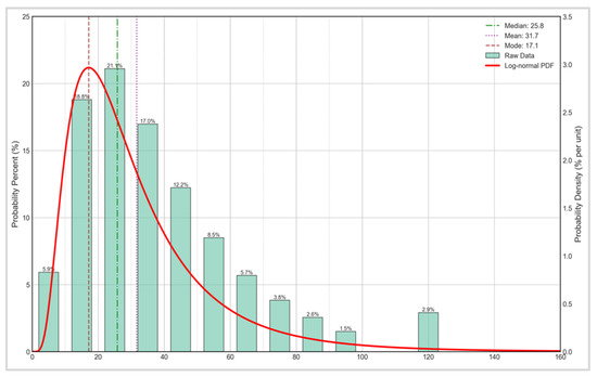 refers to the vehicle’s operation from the last full charge to the current charging, is the charging upper limit set by the user. Residential users exhibit significant stochasticity in travel behavior. Based on the Annual Report on the Big Data of New Energy Vehicle in China [24]; therefore, a log-normal distribution is adopted to model their travel distances which is shown in Figure 3, with the probability density function can be expressed as follows: