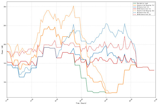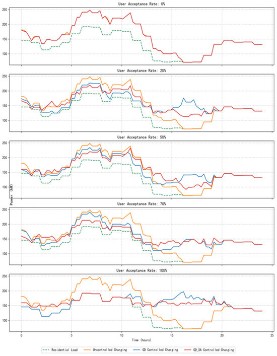 Assuming 100% user acceptance, when the number of EVs is doubled, under the GD controlled charging mode, there will be some vehicles charging before 00:00, and at 22:45, the total load is 301.9 kW, creating a new load peak. Only 2.2% of the charging electricity occurs during the afternoon (e.g., 12:00–18:00), and the daytime capacity utilization is low. In the GD-SA controlled charging mode, the charging load rises uniformly throughout the day, and during the evening peak period (18:00–22:00), the total load increases to 199 kW, which is only a 3.5% increase in comparison to the residential load, with 20.1% of the charging load occurring during the afternoon (e.g., 12:00–18:00), and 58.3% of the charging load occurring during late-night hours (e.g., after 22:00).