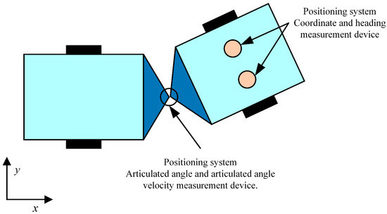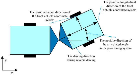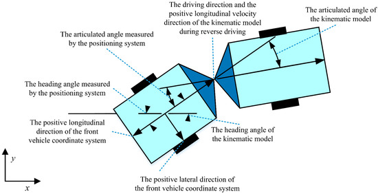 In the existing path tracking control systems for articulated steering vehicles, the positive direction of the longitudinal axis in the front axle coordinate system corresponds to the direction of the vehicle’s forward motion, with the positive direction of the lateral axis being to the left of the forward motion. Figure 3 demonstrates the positive direction of the positioning system. The positive directions of the heading angle, yaw rate, articulated angle, and articulation rate are defined as counterclockwise. The articulated angle is the difference between the heading angle of the front vehicle and that of the rear vehicle.